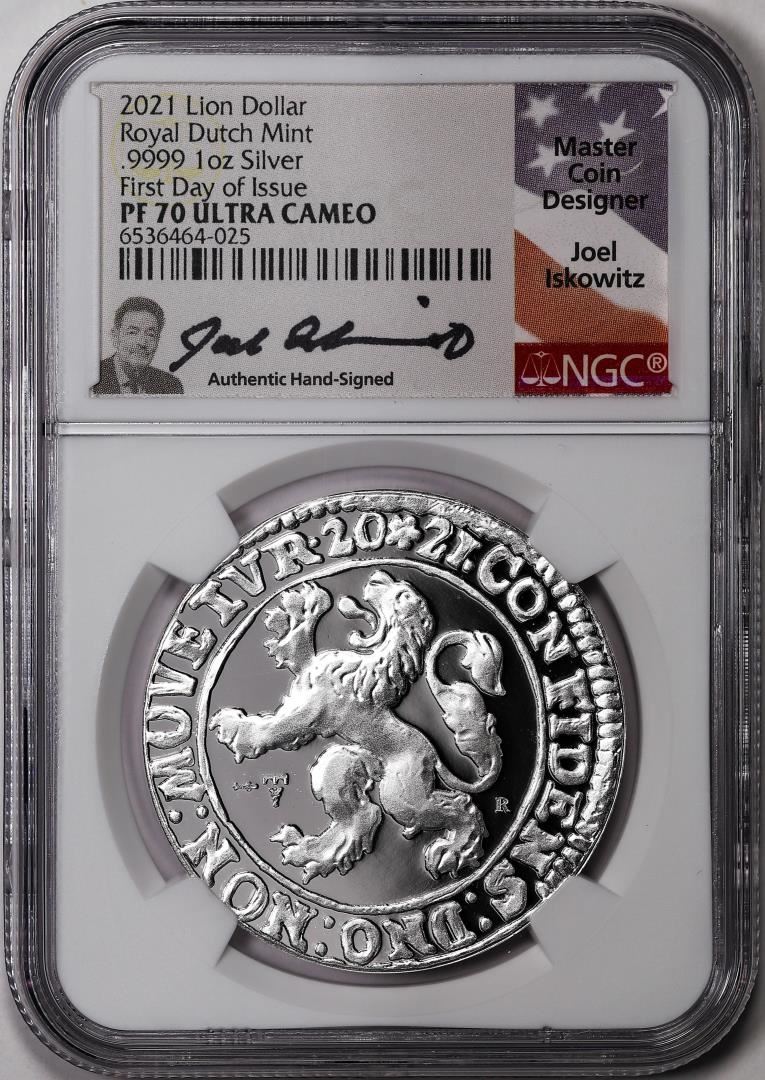 One 2021 Netherlands Proof Lion Dollar Silver Coin NGC PF70 Ultra Cameo FDOI Signed. NGC Certified.