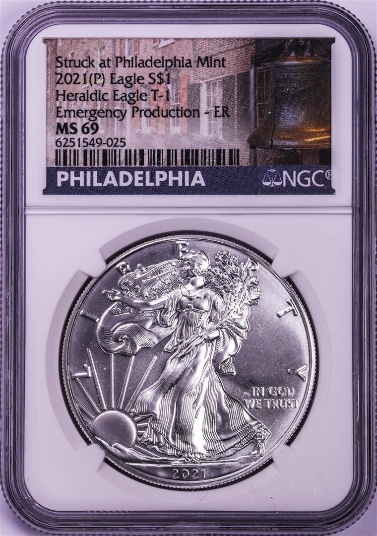 One 2021-(P) Type 1 $1 American Silver Eagle Coin NGC MS69 Early Release Emergency Issue.