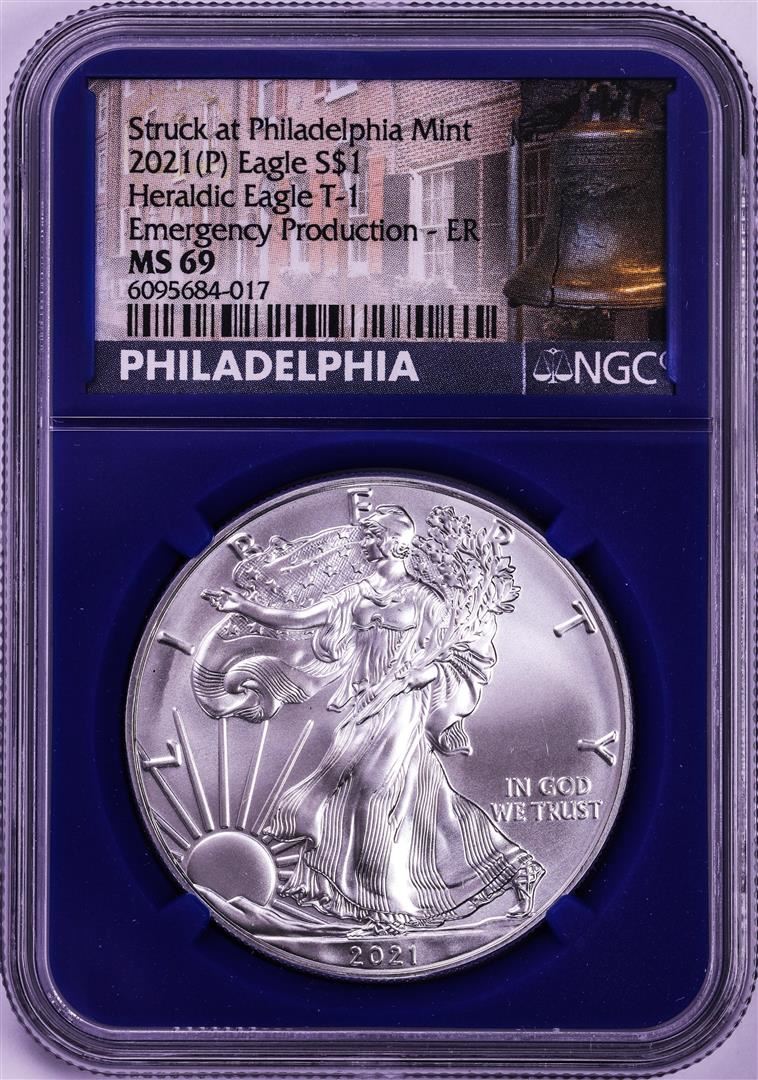 One 2021-(P) Type 1 $1 American Silver Eagle Coin NGC MS69 Early Release Emergency Issue.