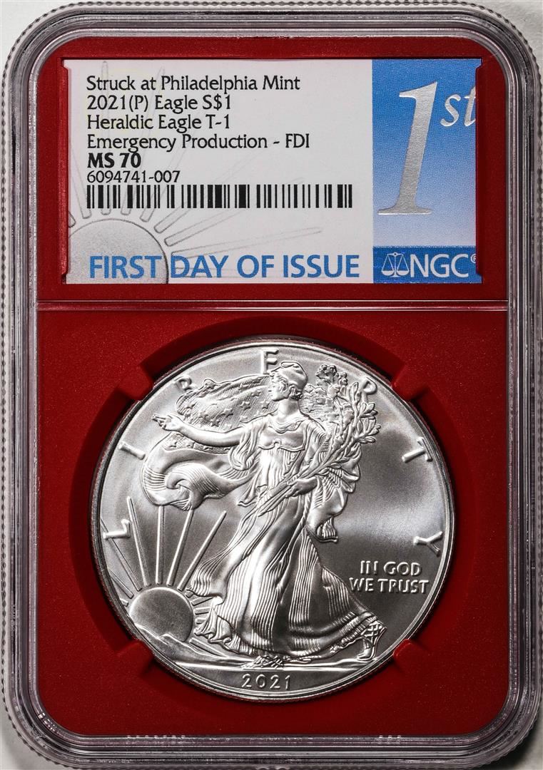 One 2021(P) Type 1 $1 American Silver Eagle Coin NGC MS70 FDI Philadelphia Red Cores. NGC Certified.