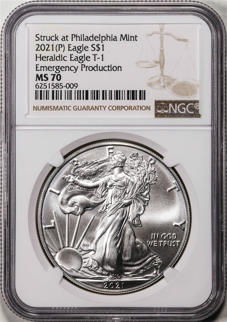 One 2021(P) Type 1 $1 American Silver Eagle Coin NGC MS70 Struck at Philadelphia. NGC Certified.