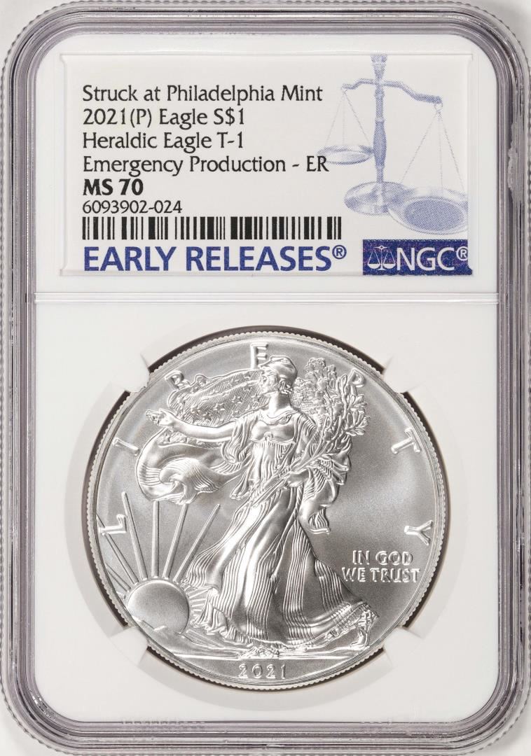 One 2021-(P) Type 1 $1 Heraldic American Silver Eagle Coin NGC MS70 Philadelphia Mint ER. NGC Certified.