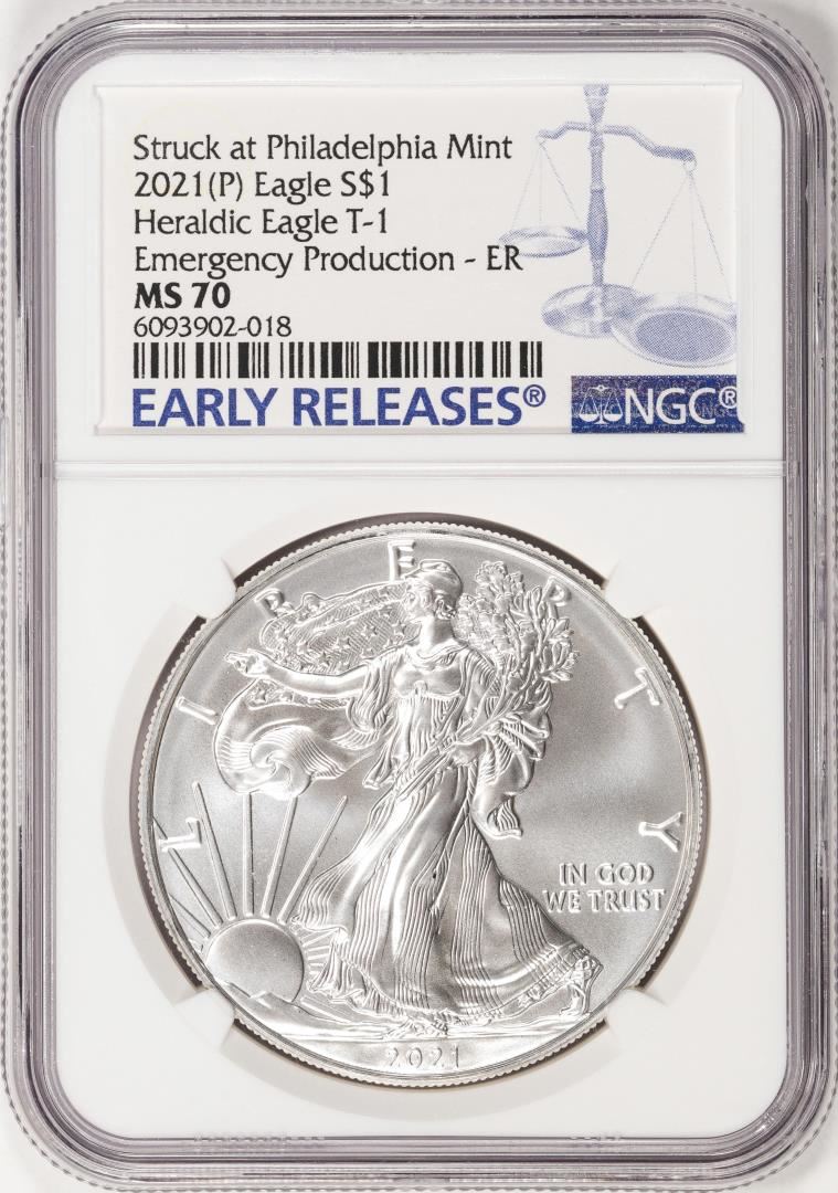 One 2021-(P) Type 1 $1 Heraldic American Silver Eagle Coin NGC MS70 Philadelphia Mint ER. NGC Certified.