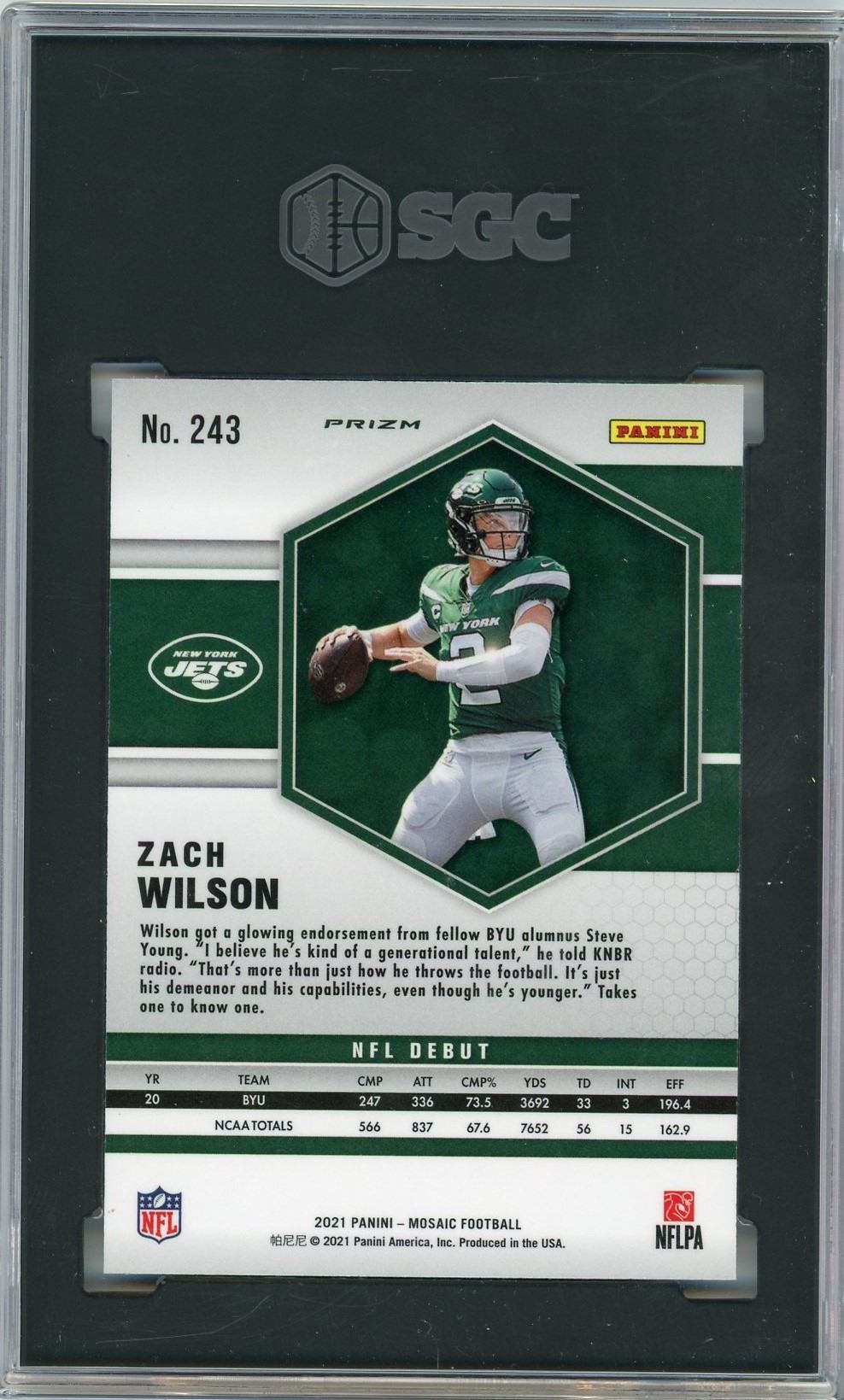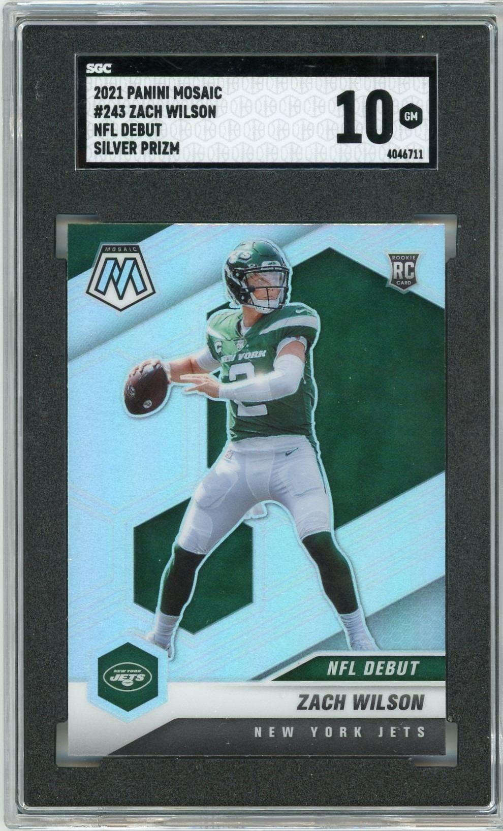 Silver rookie card of New York Jets young quarterback Zach Wilson. Graded a Gem Mint 10 by SGC widely known as the toughest to get a 10 grade with.