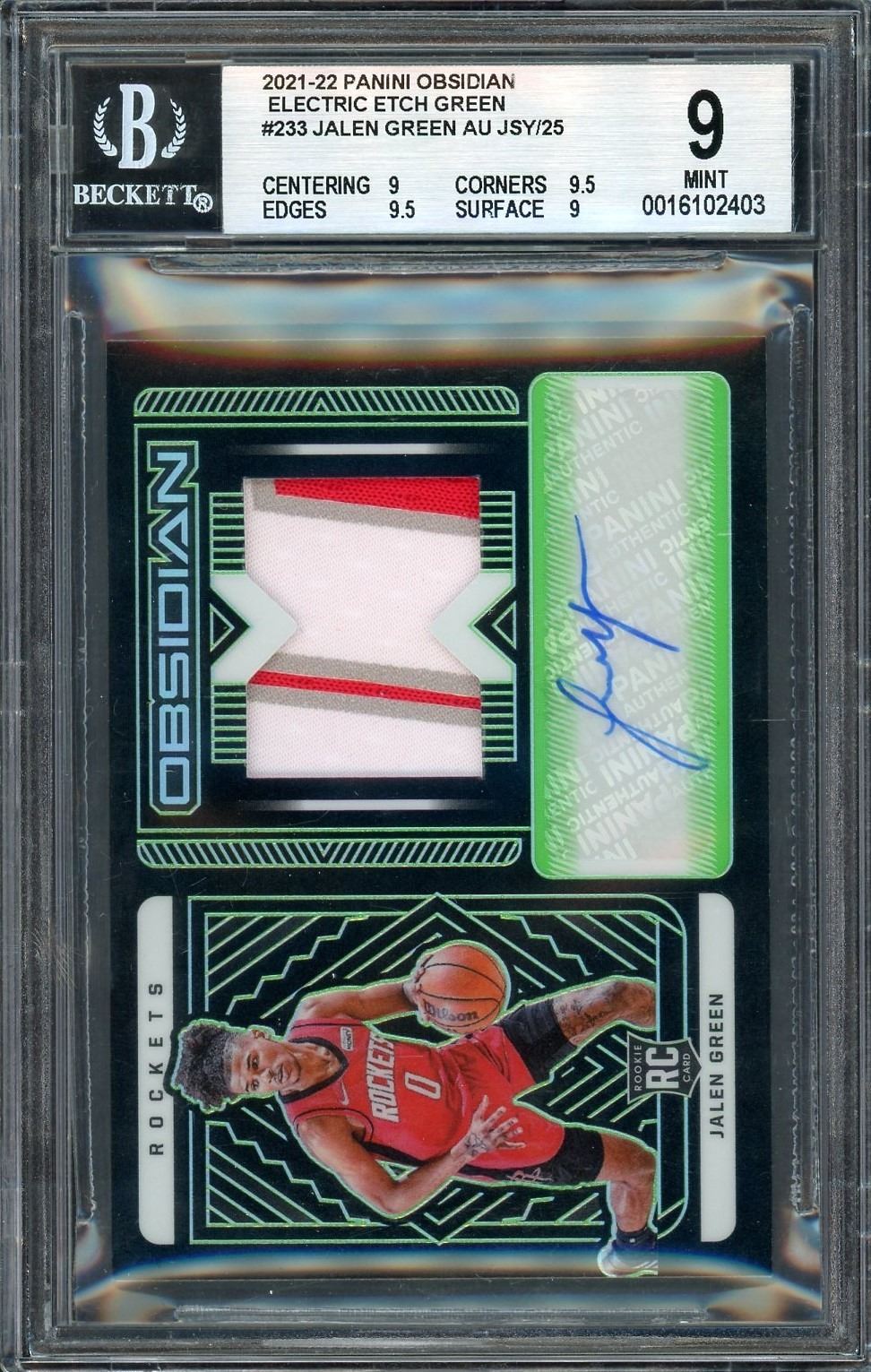 Beautiful 3 color patch autograph rookie of Houston Rockets star Jalen Green. This low numbered card is #16/25! Graded a MINT 9 by Beckett(BGS)