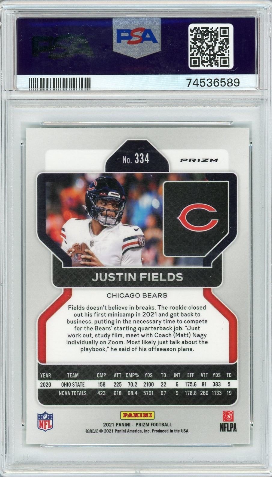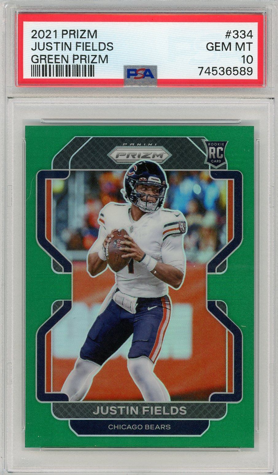 2021 Green prizm parallel rookie card of Chicago Bears young quarterback Justin Fields. graded a perfect 10 by PSA!