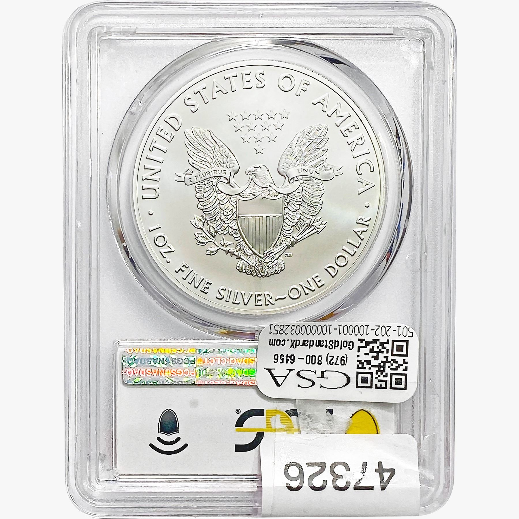 e. Coins sold referencing a third-party grading service are sold “AS IS” without any express or implied warranty, except for a guarantee by GSA that they are genuine. Removal or alteration of the holder, voids all of Bidder’s claims concerning that Product. Certain warranties may be available from the grading services and Bidders are referred to them for further details: Numismatic Guaranty Corporation (NGC), PO Box 4776, Sarasota, FL 34230, www.ngccoin.com/services/writtenguarantee.asp; Professional Coin Grading Services (PCGS), PO Box 9458, Newport Beach, CA 92658, www.pcgs.com/guarantee.html; ANACS, 6555 S. Kenton St., Ste. 303, Englewood, CO 80111; and Independent Coin Grading Co. (ICG), 7901 East Bellview, Ave., Suite 50, Englewood, CO 80111.