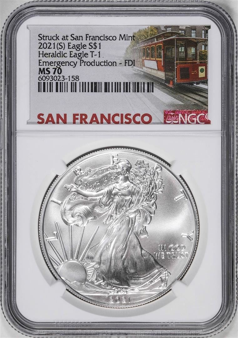 One 2021-(S) $1 Heraldic Type 1 American Silver Eagle Coin NGC MS70 FDI. NGC Certified.