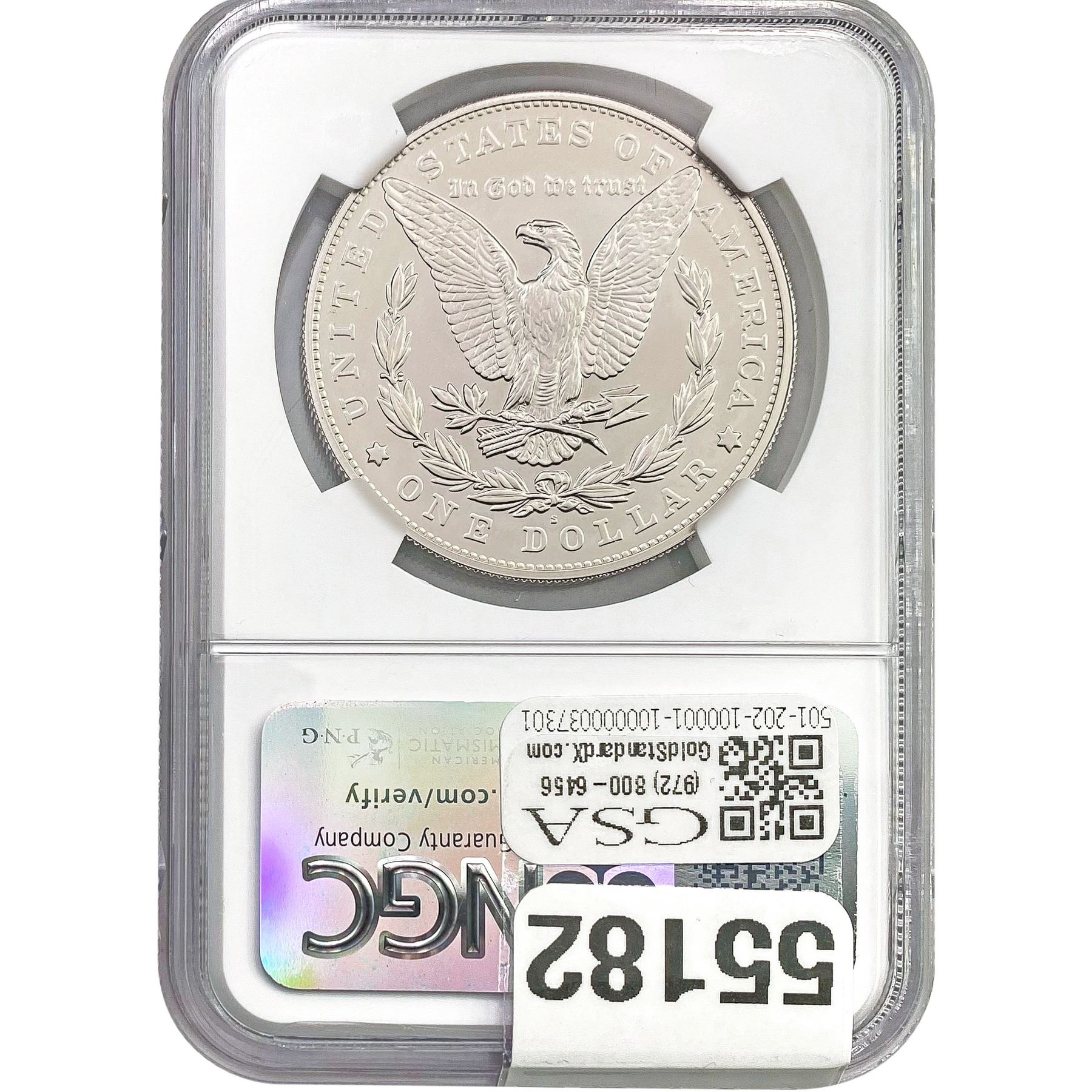 e. Coins sold referencing a third-party grading service are sold “AS IS” without any express or implied warranty, except for a guarantee by GSA that they are genuine. Removal or alteration of the holder, voids all of Bidder’s claims concerning that Product. Certain warranties may be available from the grading services and Bidders are referred to them for further details: Numismatic Guaranty Corporation (NGC), PO Box 4776, Sarasota, FL 34230, www.ngccoin.com/services/writtenguarantee.asp; Professional Coin Grading Services (PCGS), PO Box 9458, Newport Beach, CA 92658, www.pcgs.com/guarantee.html; ANACS, 6555 S. Kenton St., Ste. 303, Englewood, CO 80111; and Independent Coin Grading Co. (ICG), 7901 East Bellview, Ave., Suite 50, Englewood, CO 80111.