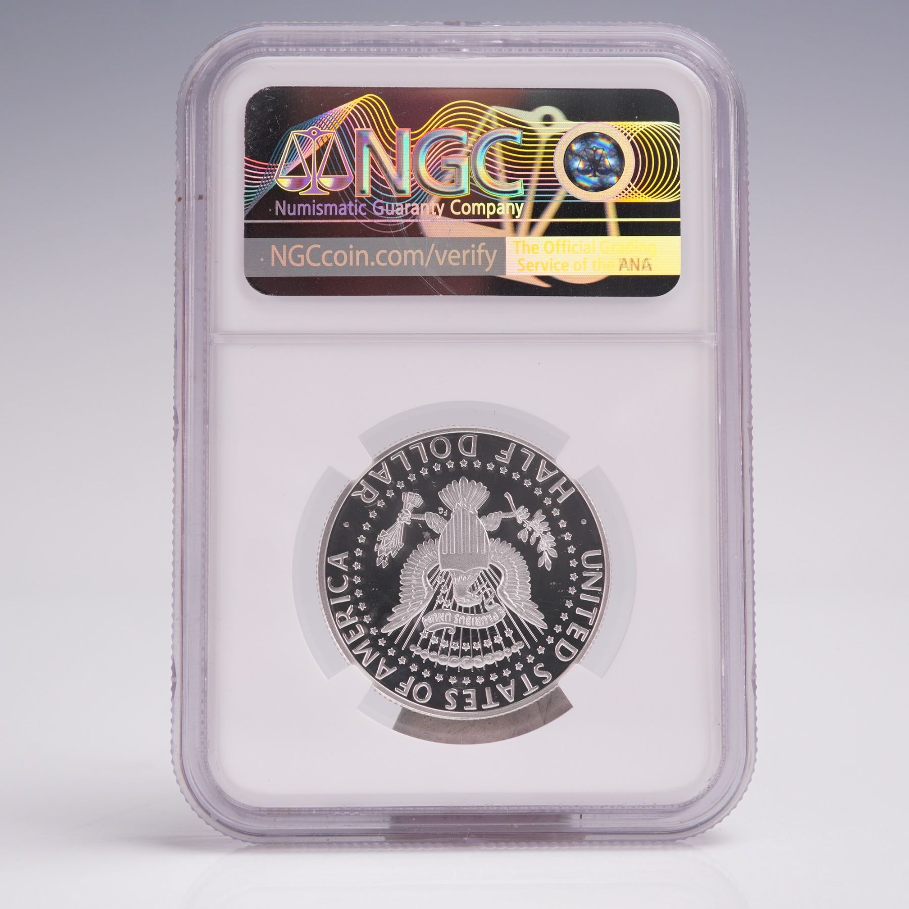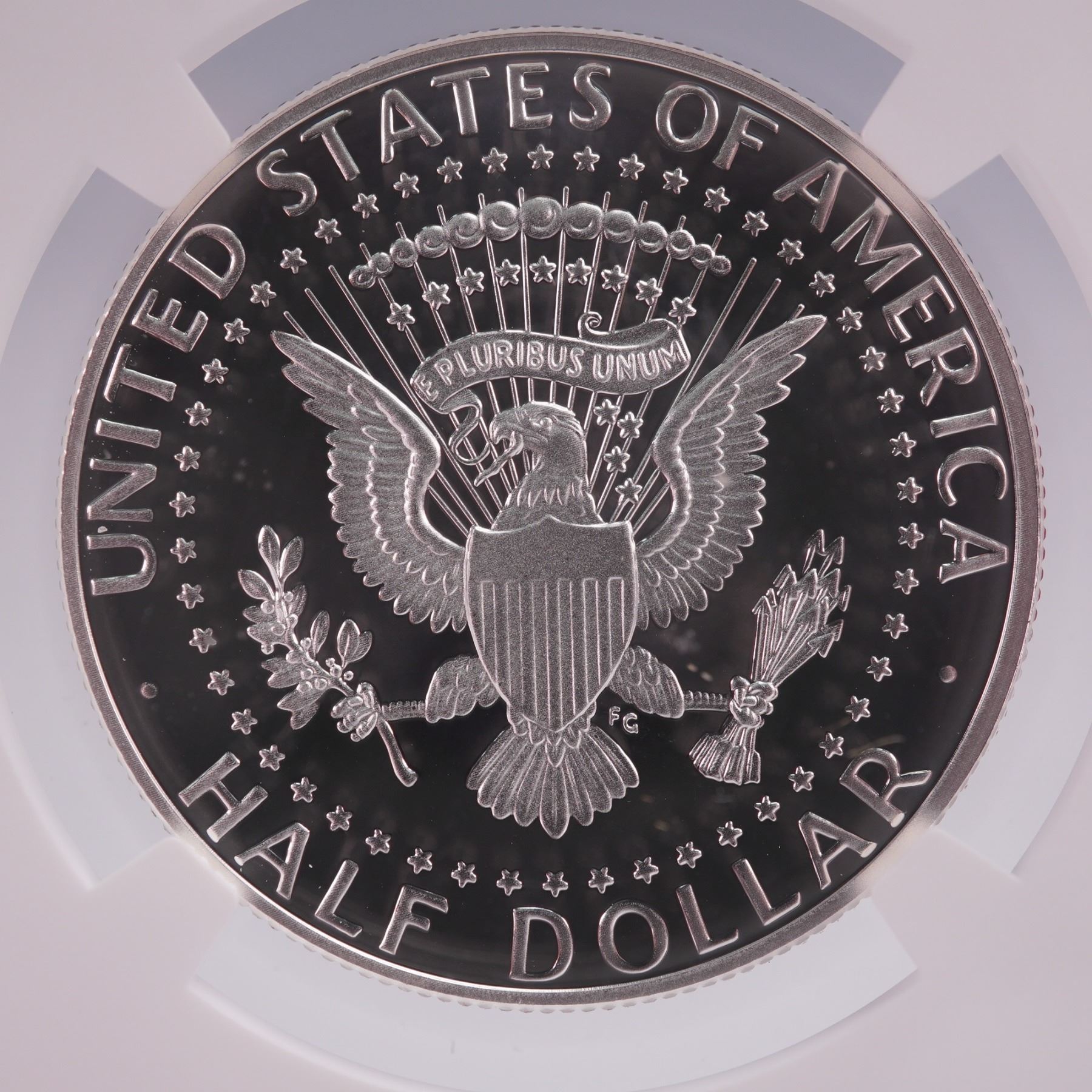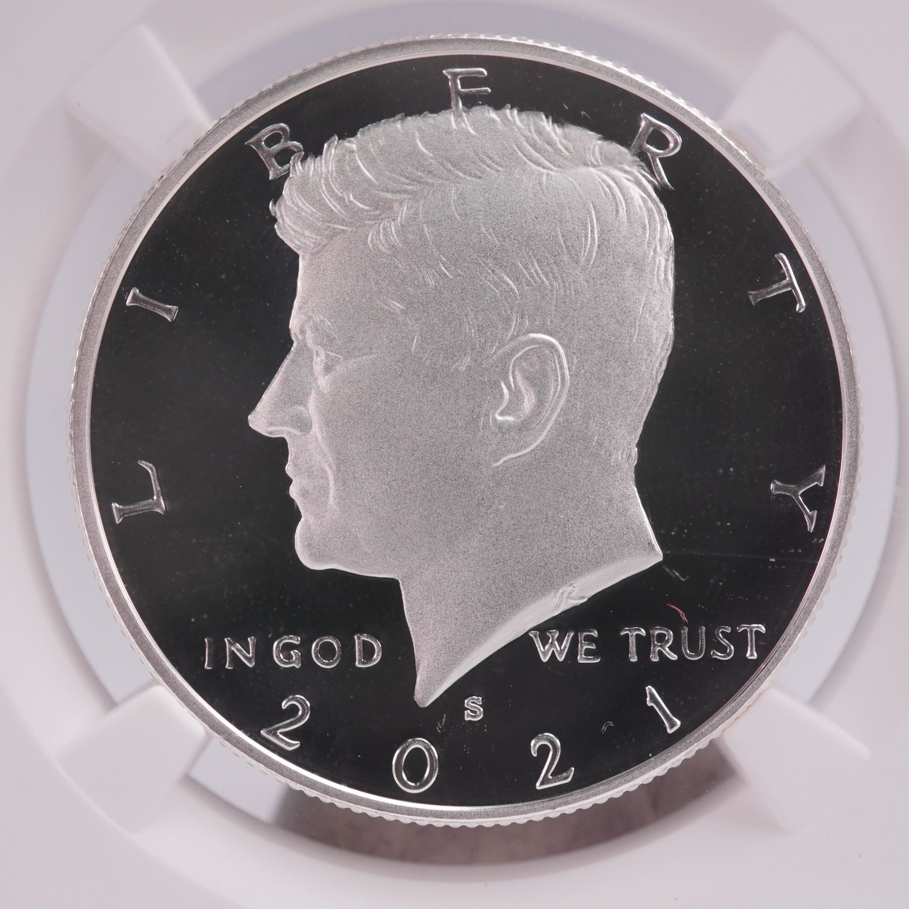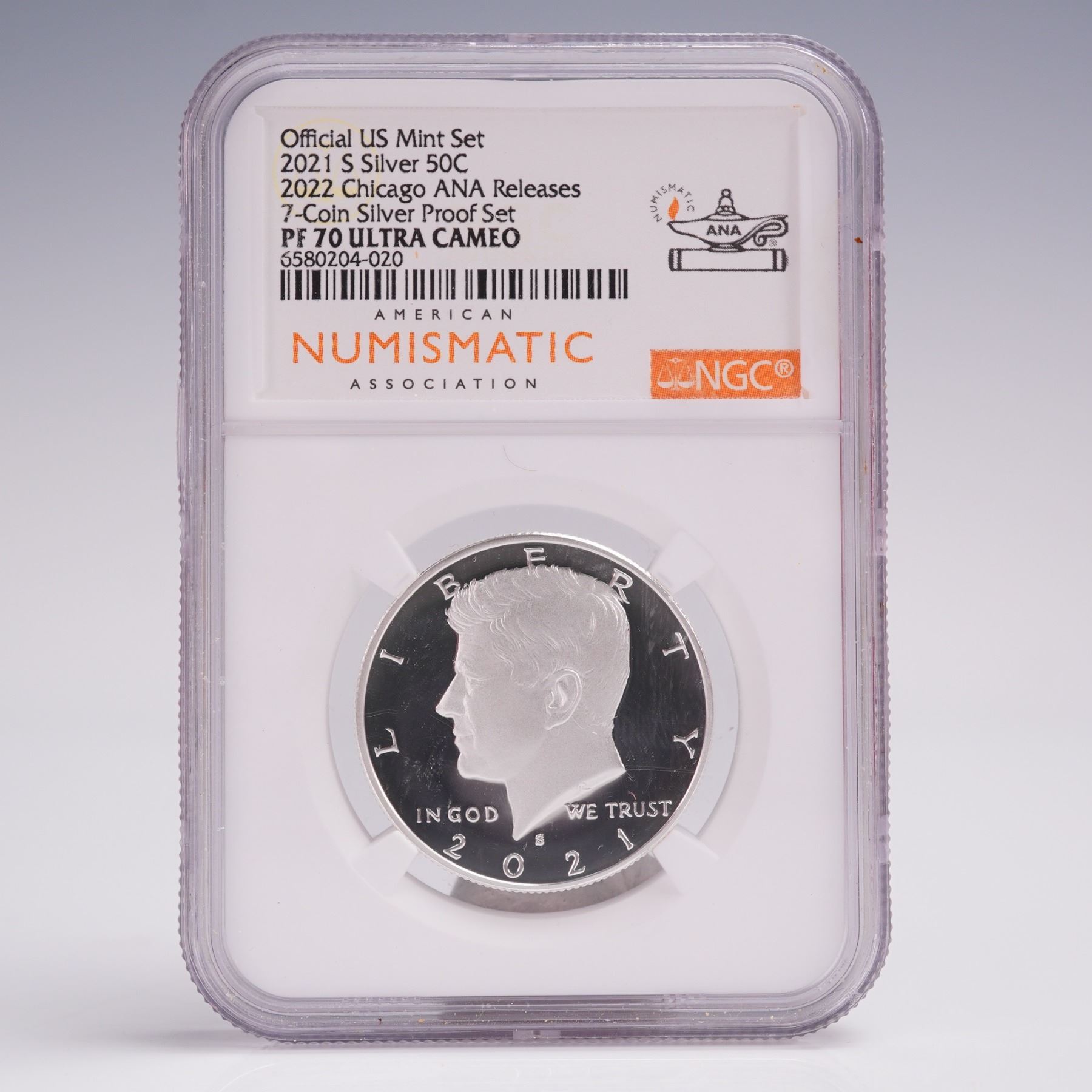 Offered is a 2021-S Silver Kennedy Half Dollar from the U.S. Mint's 7-Coin Silver Proof Set, issued for the 2022 Chicago ANA Show. Graded PF 70 Ultra Cameo by NGC, this flawless proof coin features a mirrored field and frosted devices with no visible imperfections. The obverse shows a portrait of John F. Kennedy facing left, with inscriptions LIBERTY, GR, IN GOD WE TRUST, S, and the date 2021. The reverse depicts a modified version of the Presidential Seal of the United States: a heraldic eagle bearing a striped shield on its chest, holding an olive branch and a bundle of thirteen arrows. In its beak, the eagle carries a scroll inscribed with the Latin phrase E PLURIBUS UNUM. A ring of fifty stars surrounds the eagle. Additional inscriptions include UNITED STATES OF AMERICA, HALF DOLLAR, and FG. The Latin phrase E PLURIBUS UNUM translates to "Out of Many, One." Obverse designer and engraver: Gilroy Roberts. Reverse designer and engraver: Frank Gasparro. The coin is sealed in an official NGC holder with ANA label.