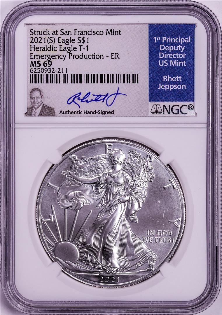 2021(S) Ty. 1 $1 American Silver Eagle Coin NGC MS69 Jeppson Signed Emergency Release
