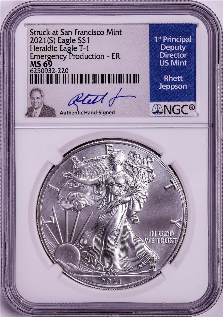 2021(S) Ty. 1 $1 American Silver Eagle Coin NGC MS69 Jeppson Signed Emergency Release