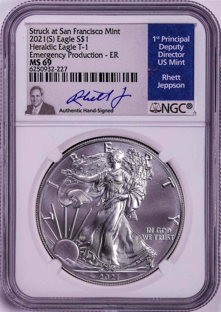 2021(S) Ty. 1 $1 American Silver Eagle Coin NGC MS69 Jeppson Signed Emergency Release