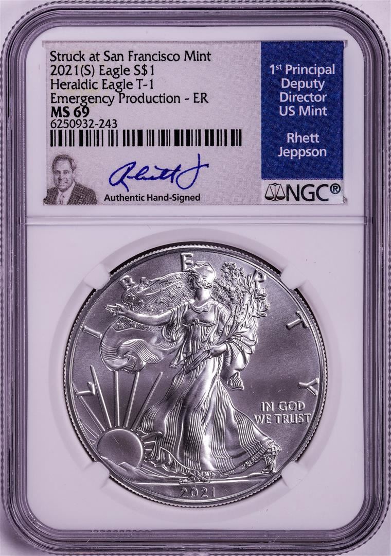 2021(S) Ty. 1 $1 American Silver Eagle Coin NGC MS69 Jeppson Signed Emergency Release