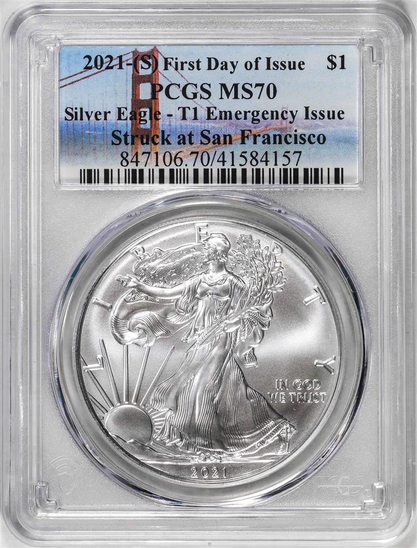 2021-(S) Ty. 1 $1 American Silver Eagle Coin PCGS MS70 First Day of Issue Emergency SF