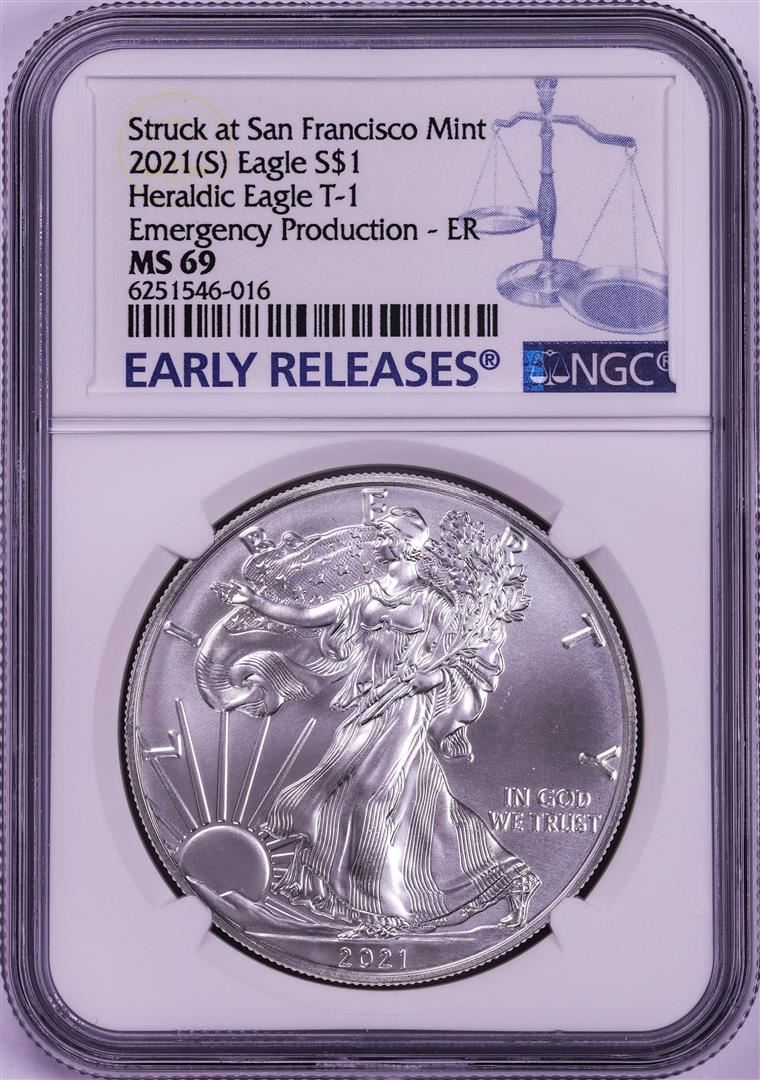 One 2021-(S) Type 1 $1 American Silver Eagle Coin NGC MS69 Early Release Emergency Issue.
