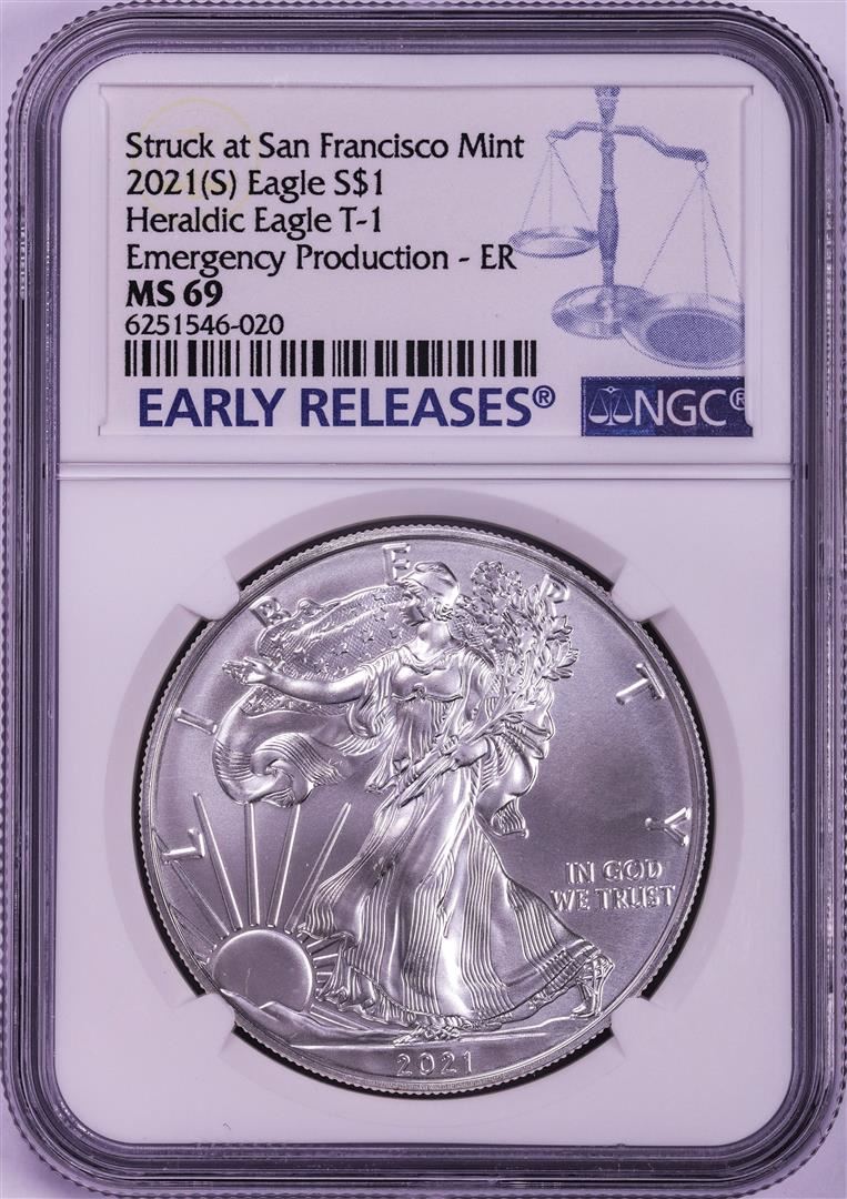 One 2021-(S) Type 1 $1 American Silver Eagle Coin NGC MS69 Early Release Emergency Issue.