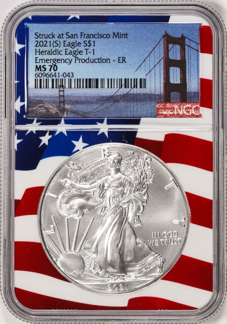 One 2021(S) Type 1 $1 American Silver Eagle Coin NGC MS70 ER San Francisco Flag Core. NGC Certified.