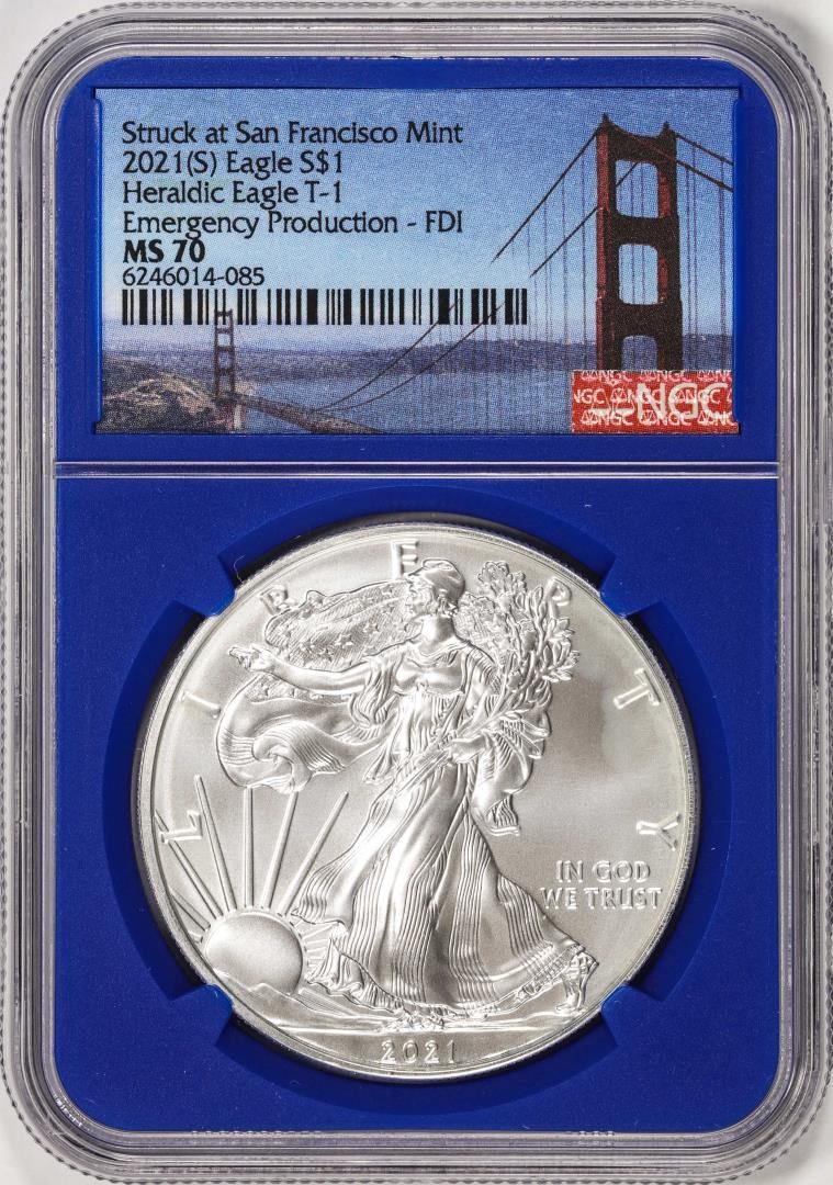 2021(S) Type 1 $1 American Silver Eagle Coin NGC MS70 FDI San Francisco Blue Core