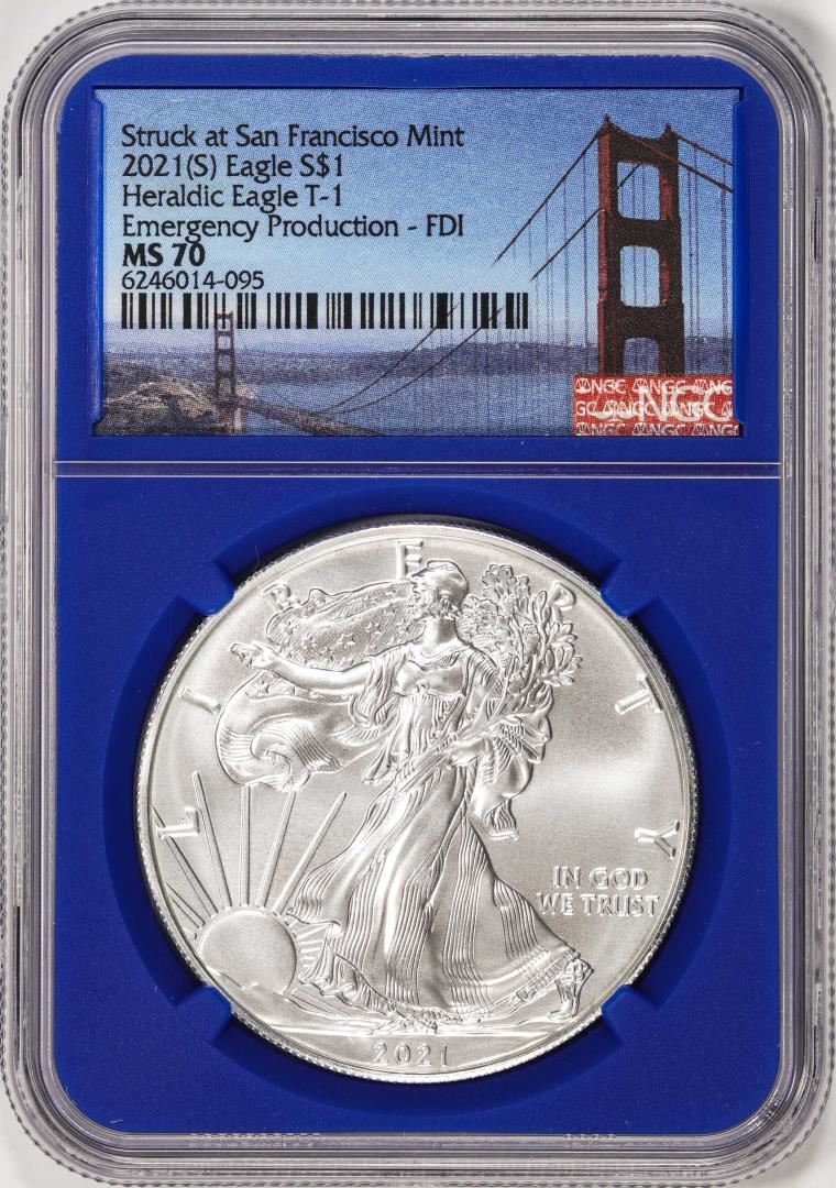 2021(S) Type 1 $1 American Silver Eagle Coin NGC MS70 FDI San Francisco Blue Core