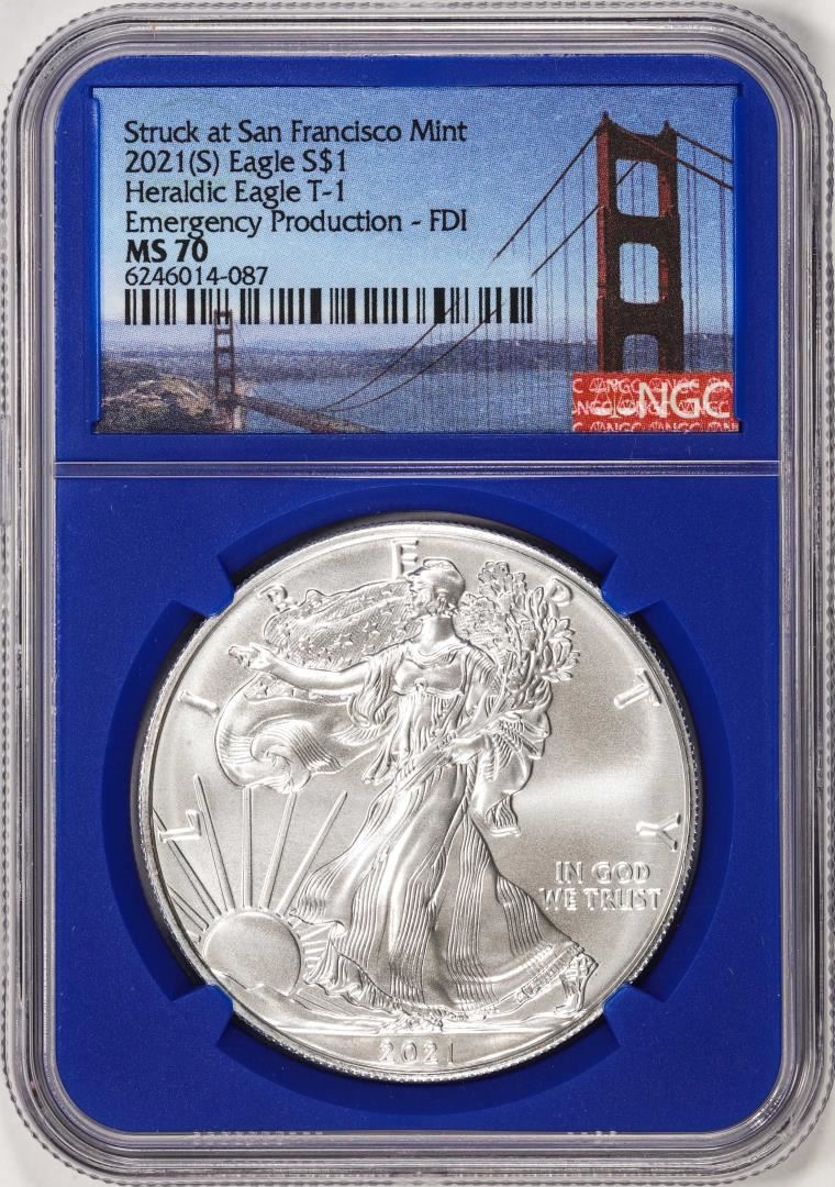 2021(S) Type 1 $1 American Silver Eagle Coin NGC MS70 FDI San Francisco Blue Core
