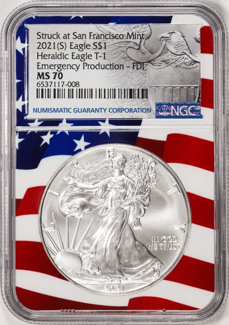 2021(S) Type 1 $1 American Silver Eagle Coin NGC MS70 FDI San Francisco Flag Core