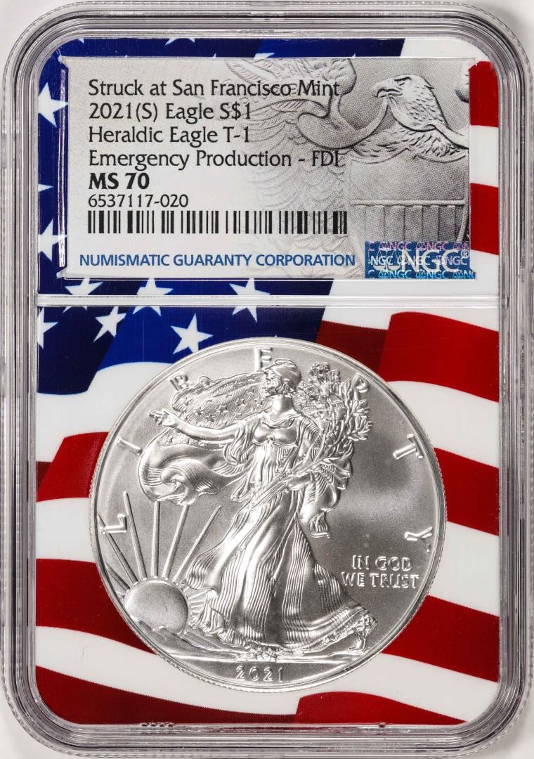One 2021(S) Type 1 $1 American Silver Eagle Coin NGC MS70 FDI San Francisco Flag Core. NGC Certified.