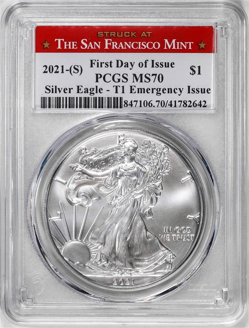 2021-(S) Type 1 $1 American Silver Eagle Coin PCGS MS70 First Day of Issue Emergency