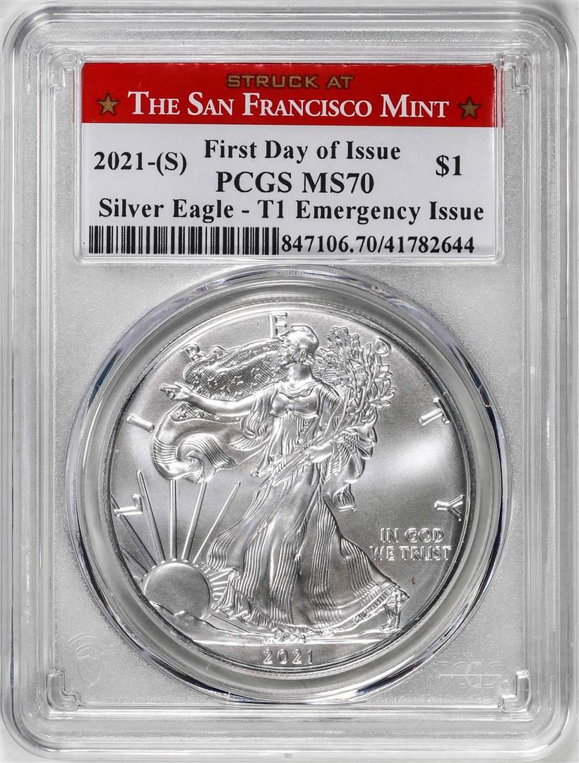 2021-(S) Type 1 $1 American Silver Eagle Coin PCGS MS70 First Day of Issue Emergency