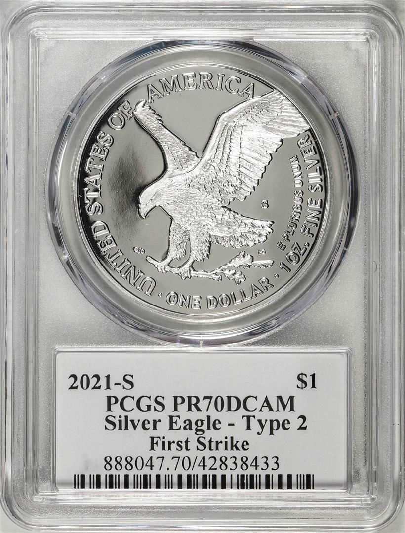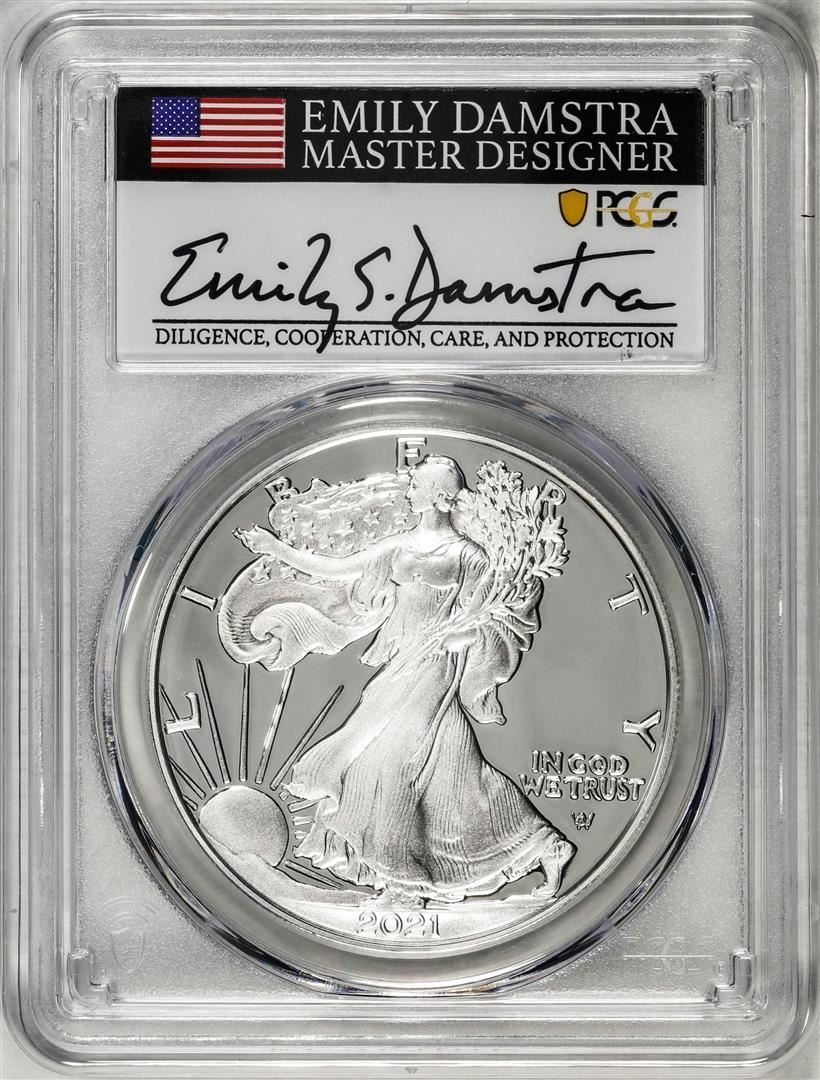 One 2021-S Type 2 $1 American Silver Eagle Coin PCGS PR70DCAM Emily Damstra Signature FS. PCGS Graded.