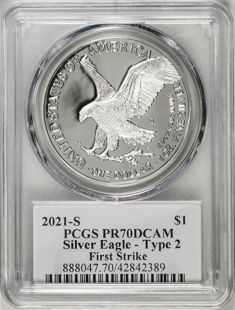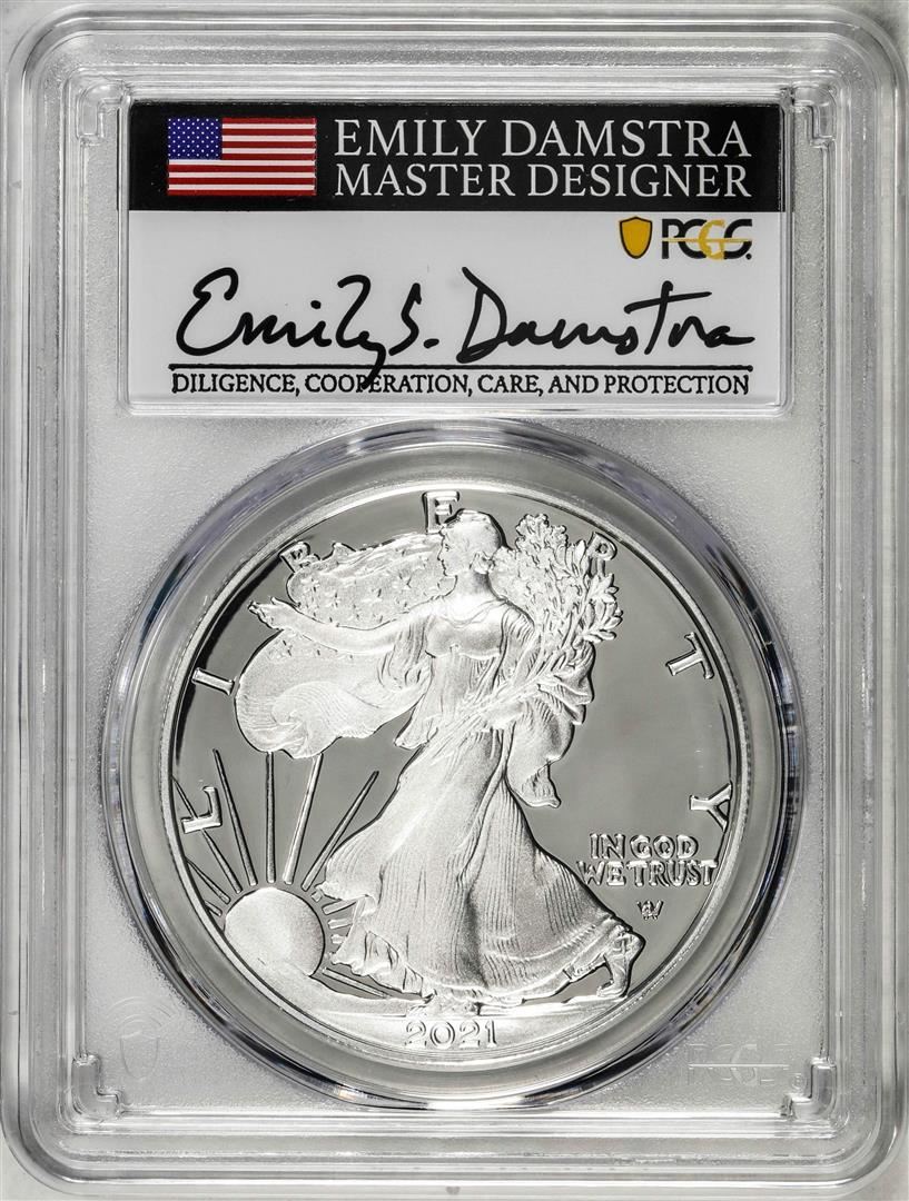 One 2021-S Type 2 $1 American Silver Eagle Coin PCGS PR70DCAM Emily Damstra Signature FS. PCGS Graded.