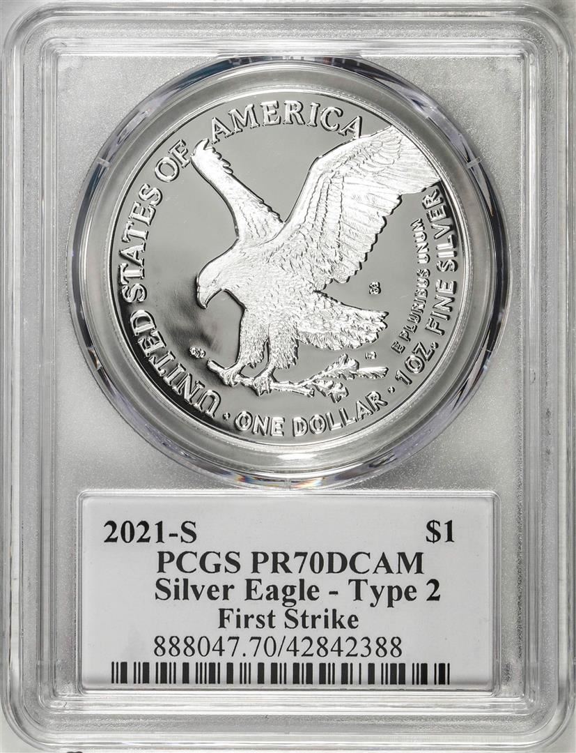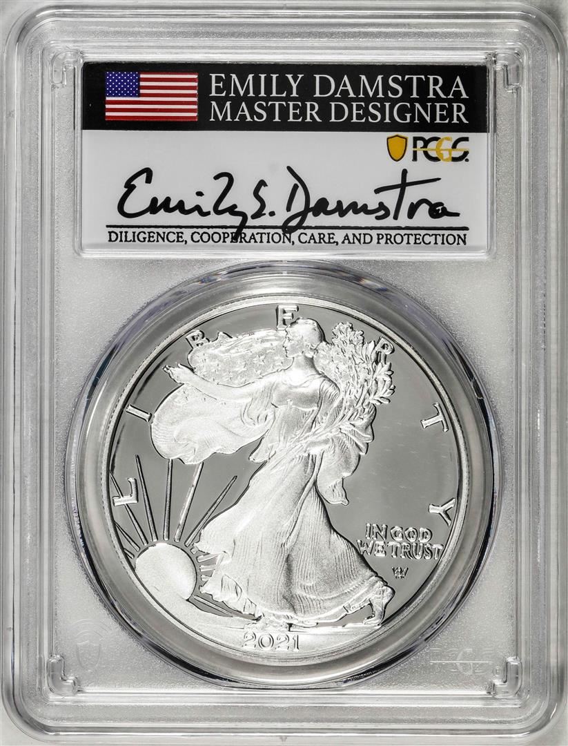 One 2021-S Type 2 $1 American Silver Eagle Coin PCGS PR70DCAM Emily Damstra Signature FS. PCGS Graded.