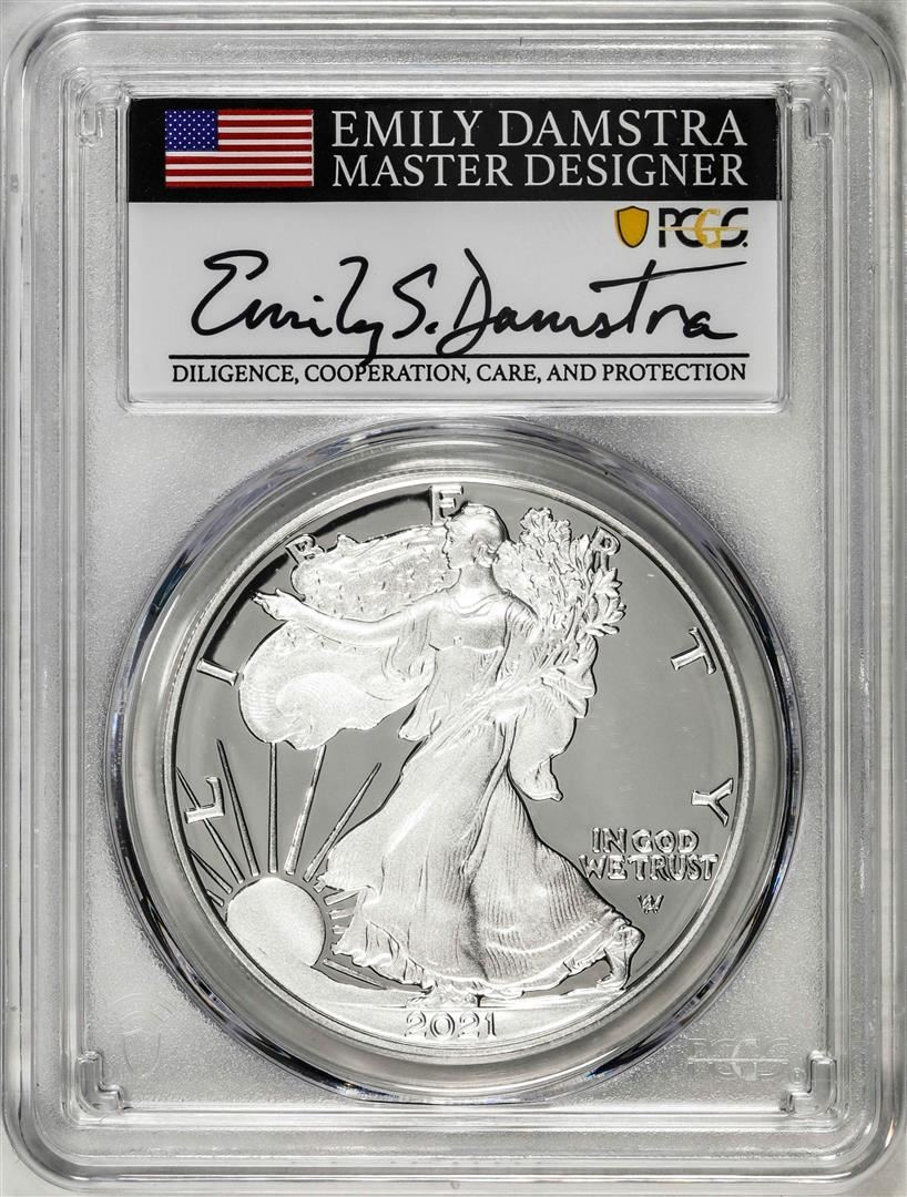 One 2021-S Type 2 $1 American Silver Eagle Coin PCGS PR70DCAM Emily Damstra Signature FS. PCGS Graded.