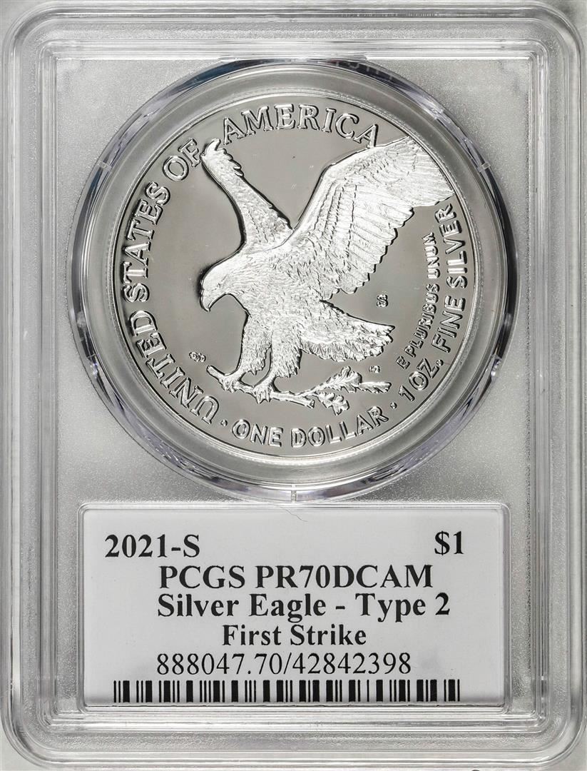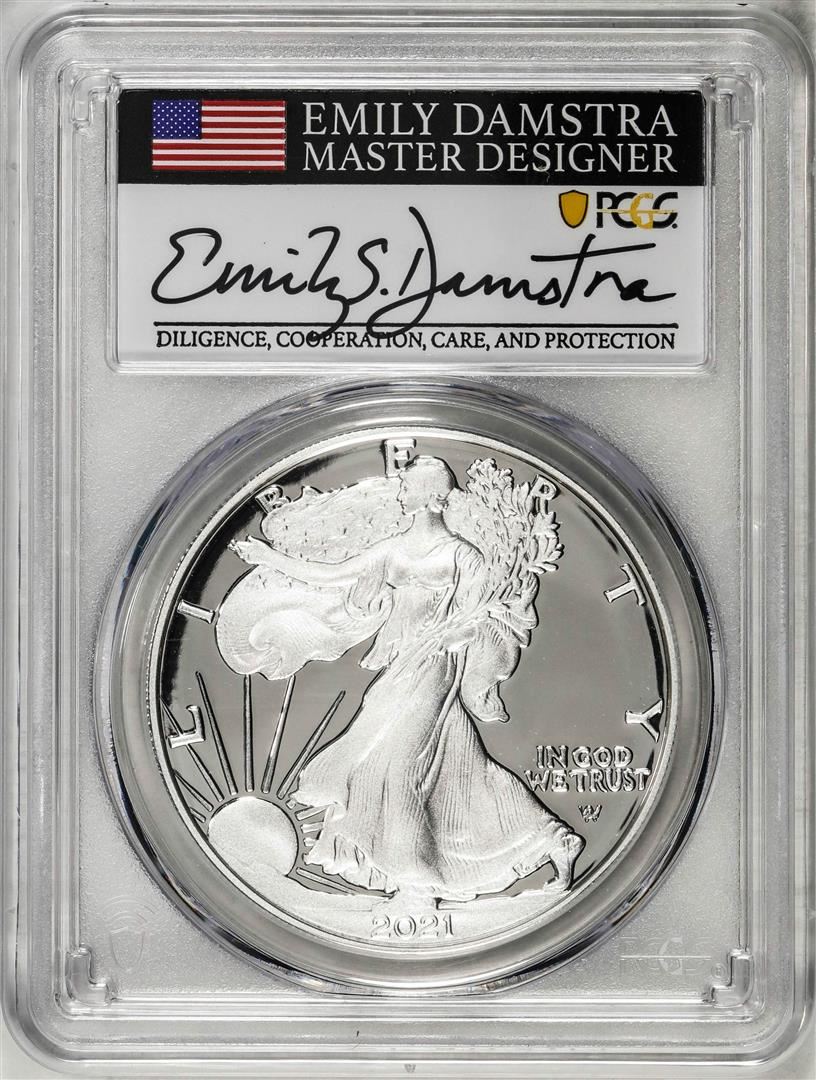 One 2021-S Type 2 $1 American Silver Eagle Coin PCGS PR70DCAM Emily Damstra Signature FS. PCGS Graded.