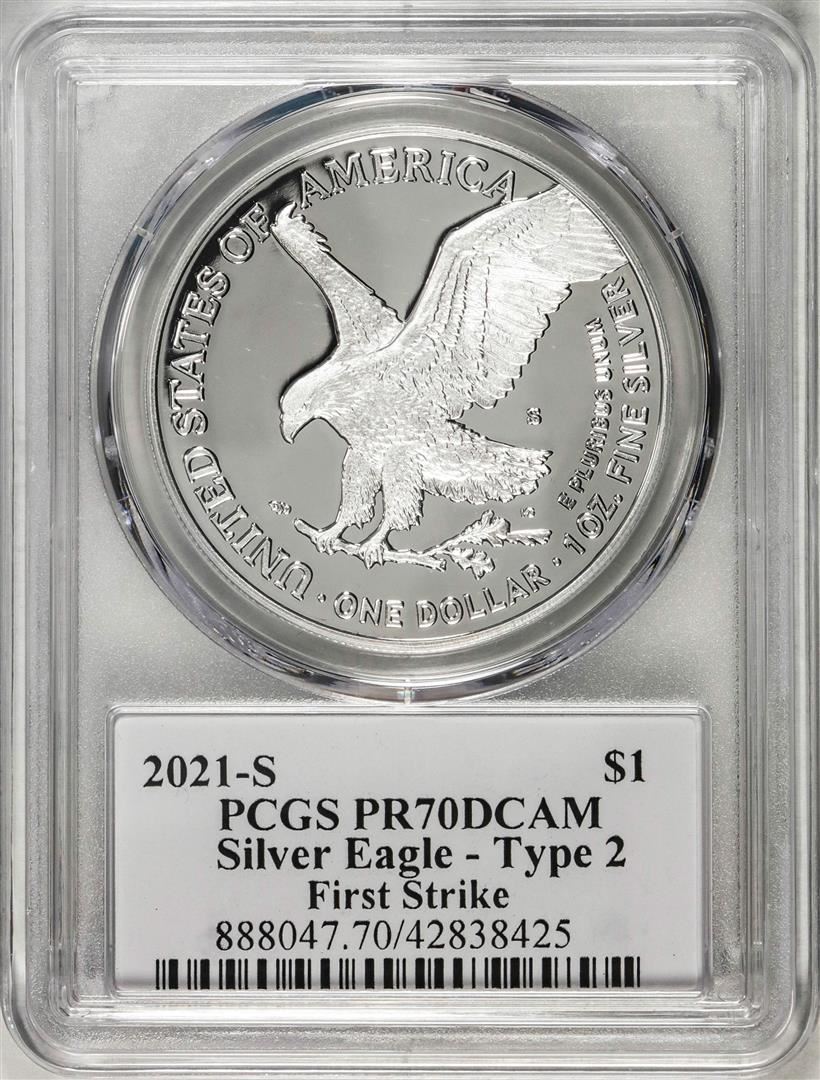 One 2021-S Type 2 $1 American Silver Eagle Coin PCGS PR70DCAM Emily Damstra Signature FS. PCGS Graded.