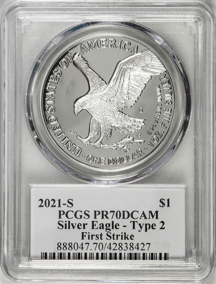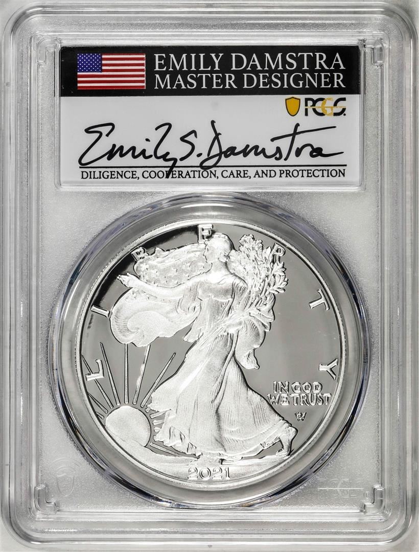 One 2021-S Type 2 $1 American Silver Eagle Coin PCGS PR70DCAM Emily Damstra Signature FS. PCGS Graded.