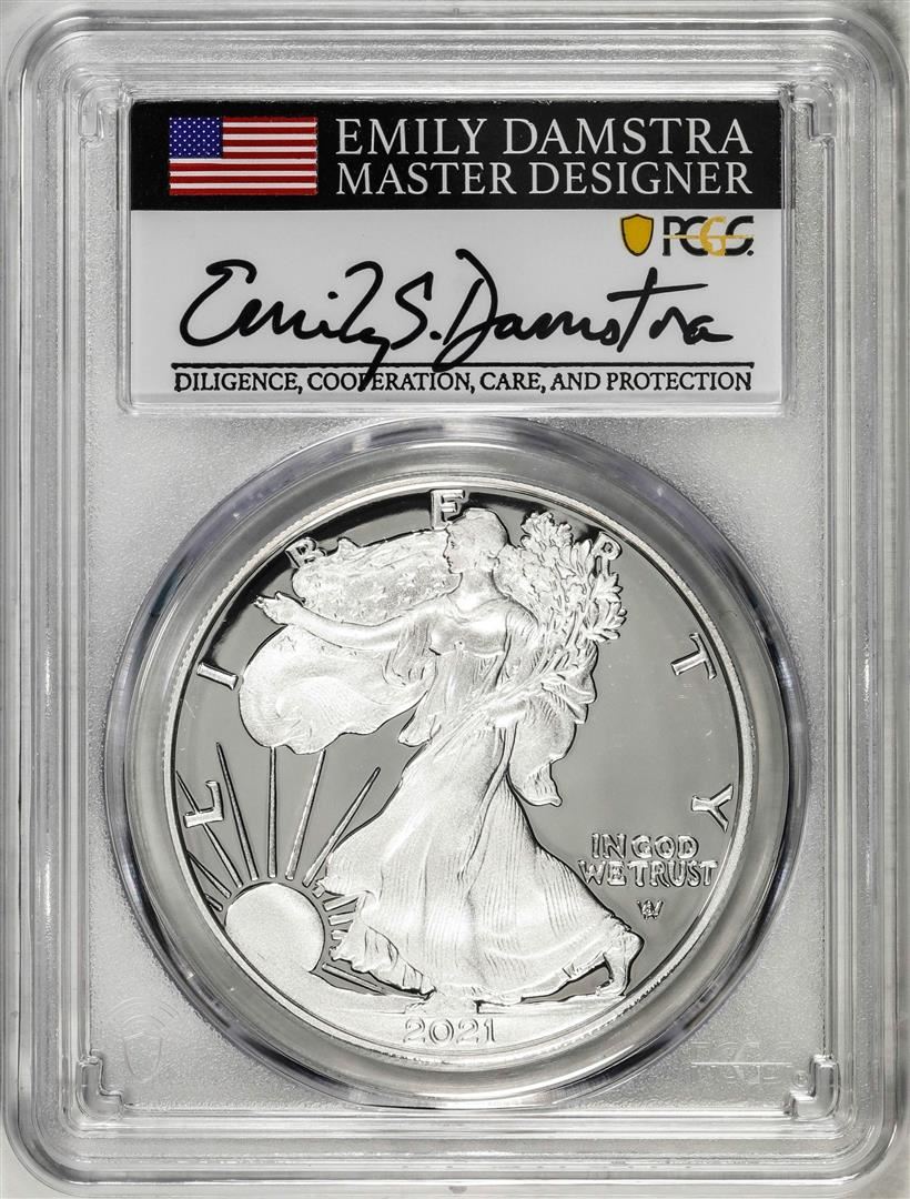 One 2021-S Type 2 $1 American Silver Eagle Coin PCGS PR70DCAM Emily Damstra Signature FS. PCGS Graded.