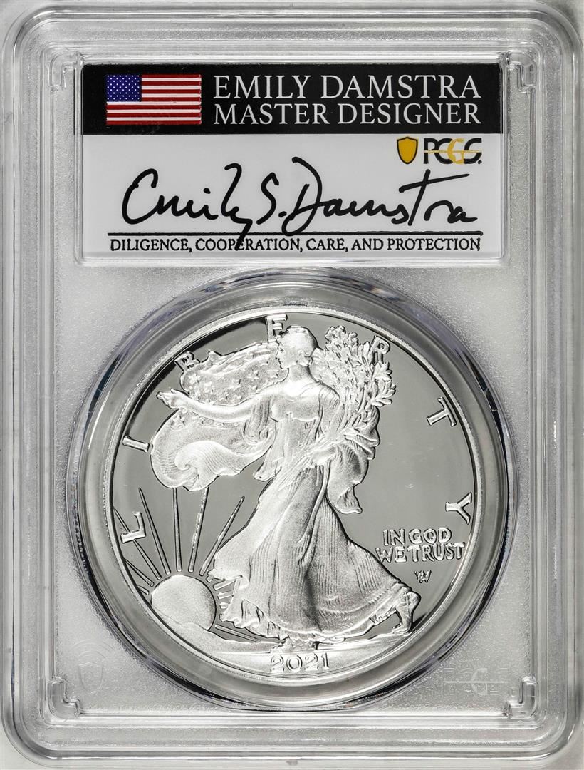 One 2021-S Type 2 $1 American Silver Eagle Coin PCGS PR70DCAM Emily Damstra Signature FS. PCGS Graded.
