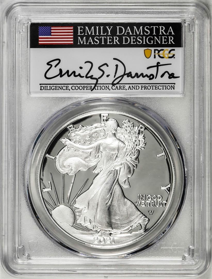 One 2021-S Type 2 $1 American Silver Eagle Coin PCGS PR70DCAM Emily Damstra Signature FS. PCGS Graded.