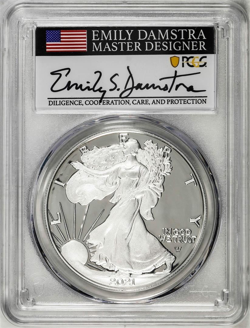 One 2021-S Type 2 $1 American Silver Eagle Coin PCGS PR70DCAM Emily Damstra Signature FS. PCGS Graded.