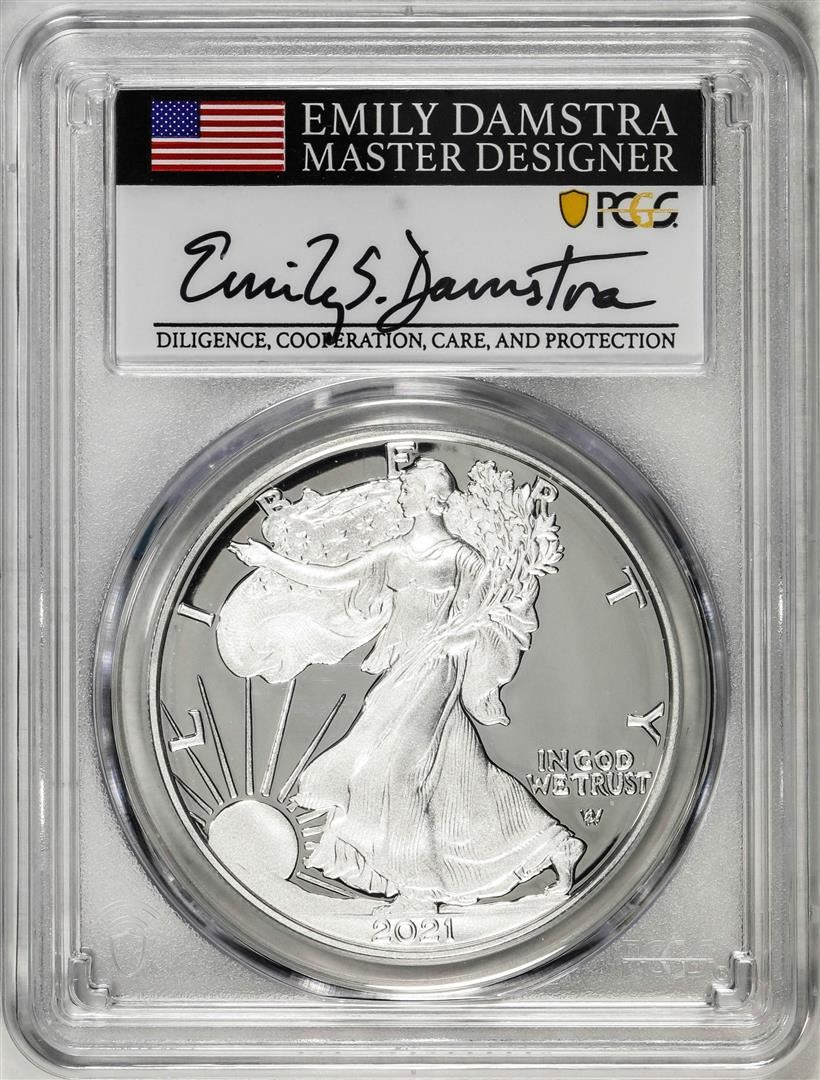One 2021-S Type 2 $1 American Silver Eagle Coin PCGS PR70DCAM Emily Damstra Signature FS. PCGS Graded.