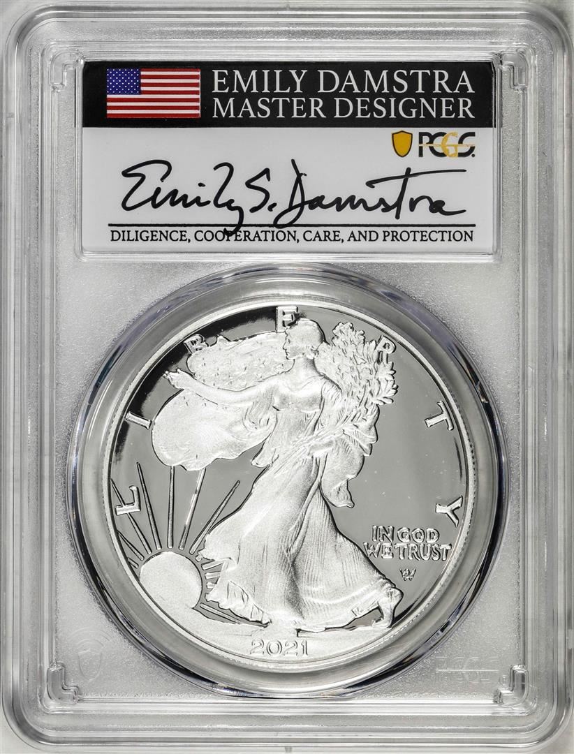 One 2021-S Type 2 $1 American Silver Eagle Coin PCGS PR70DCAM Emily Damstra Signature FS. PCGS Graded.