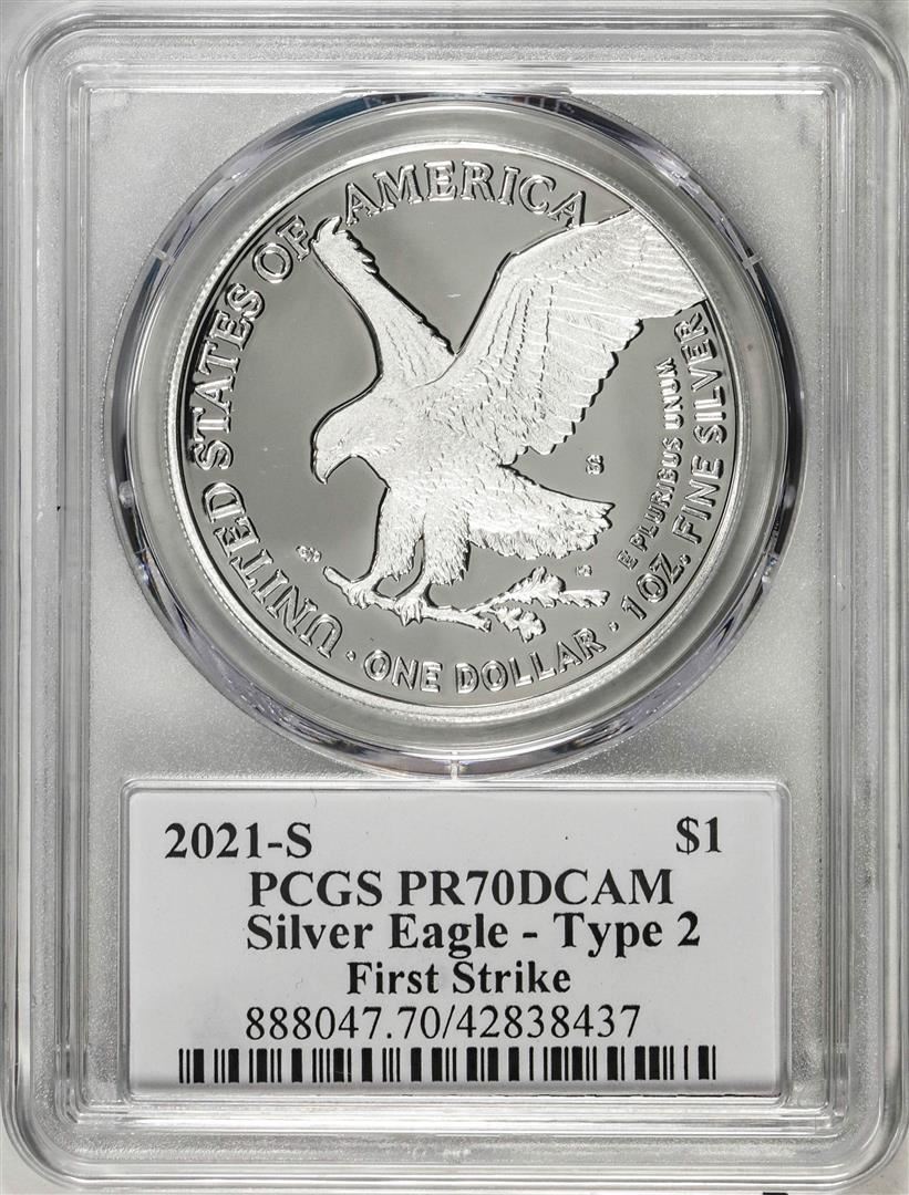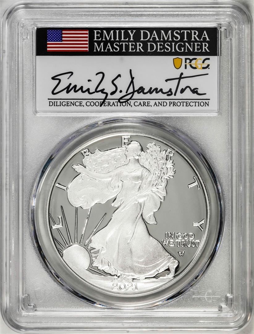 One 2021-S Type 2 $1 American Silver Eagle Coin PCGS PR70DCAM Emily Damstra Signature FS. PCGS Graded.