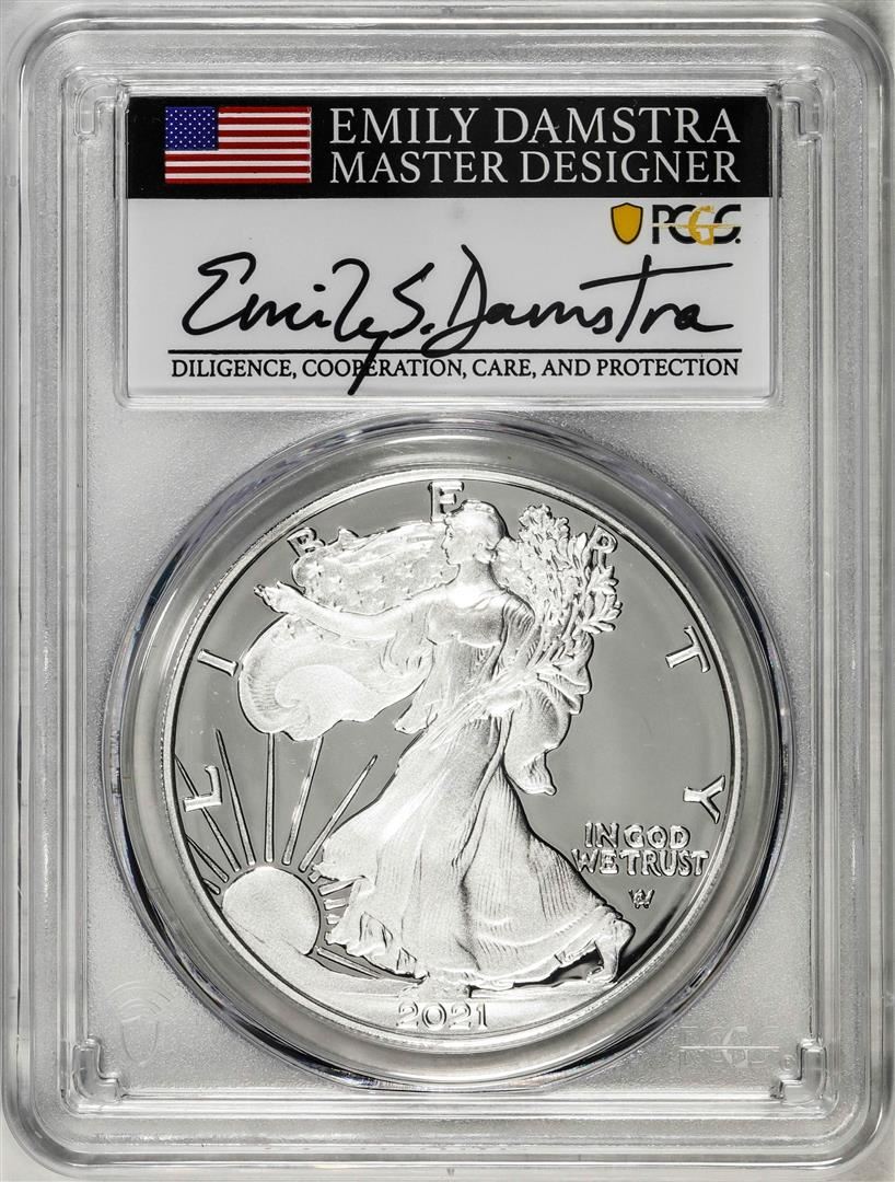 One 2021-S Type 2 $1 American Silver Eagle Coin PCGS PR70DCAM Emily Damstra Signature FS. PCGS Graded.