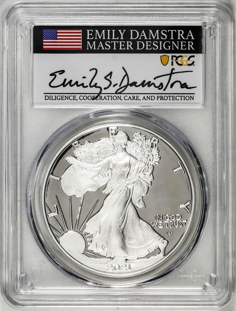 One 2021-S Type 2 $1 American Silver Eagle Coin PCGS PR70DCAM Emily Damstra Signature FS. PCGS Graded.