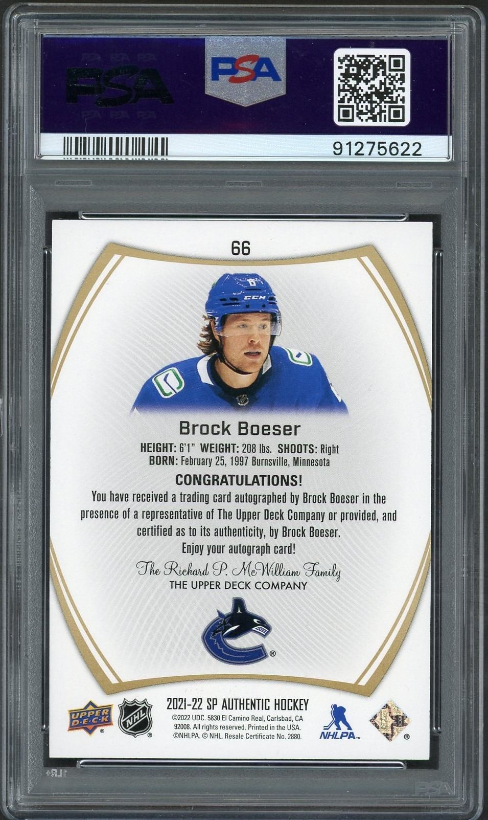 2021-22 SP Authentic Limited Autograph of Canucks star forward(maybe not after the trade deadline) Brock Boeser graded a gem mint 10 by PSA!