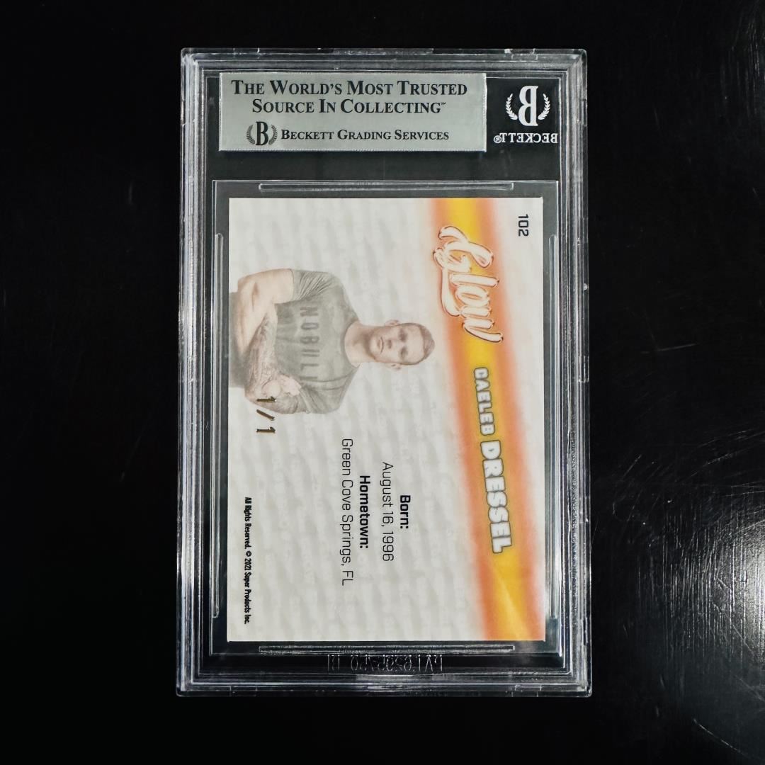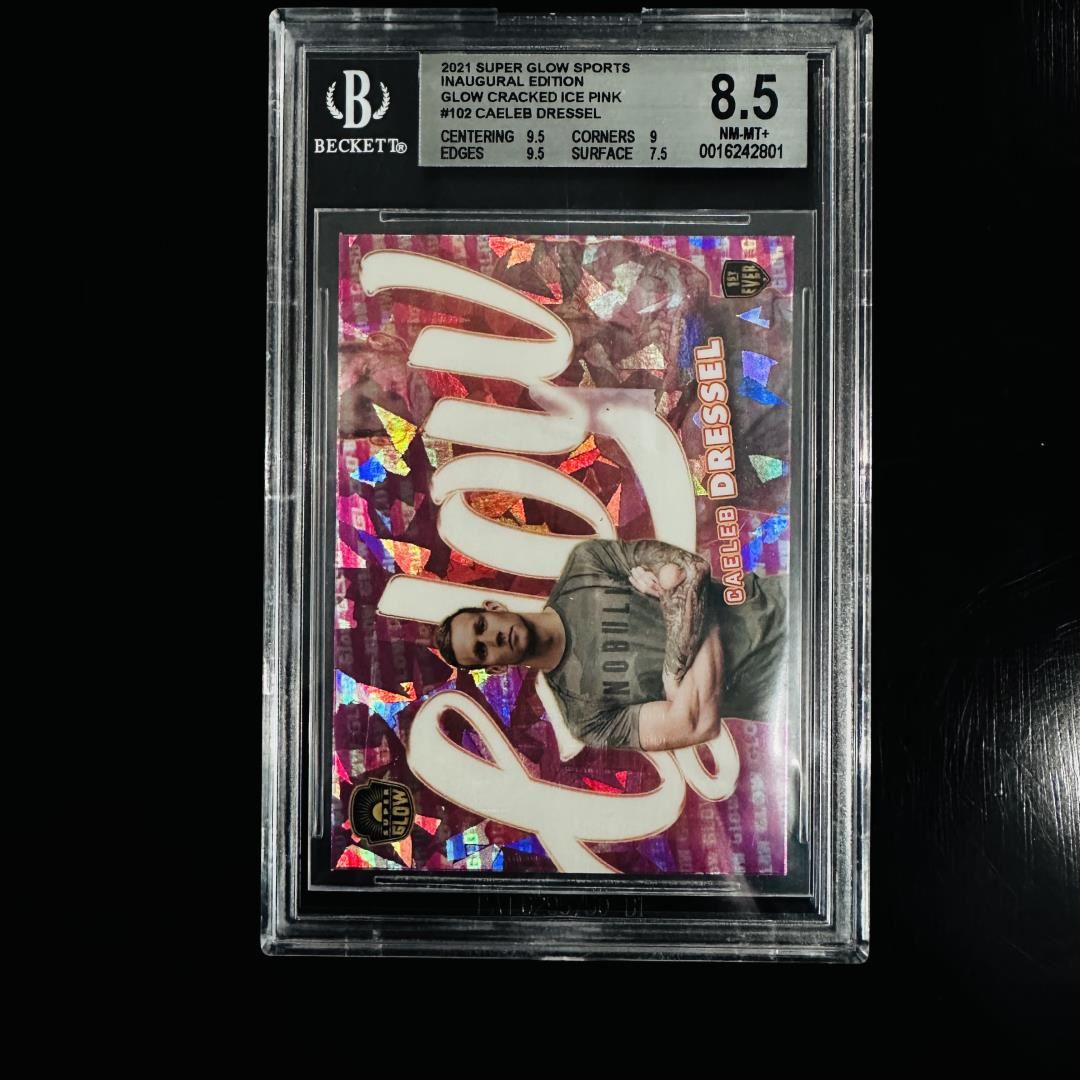 This 2021 Super Glow Inaugural Edition Cracked Ice Pink card features Olympic champion Caeleb Dressel in a striking full-art design. Graded BGS 8.5, the card showcases 9.5 centering and edges, 9 corners, and a 7.5 surface grade. The flashy pink prismatic background adds visual punch to this high-grade slab of an elite athlete. A strong addition for collectors of Olympic memorabilia or standout non-traditional sports cards.