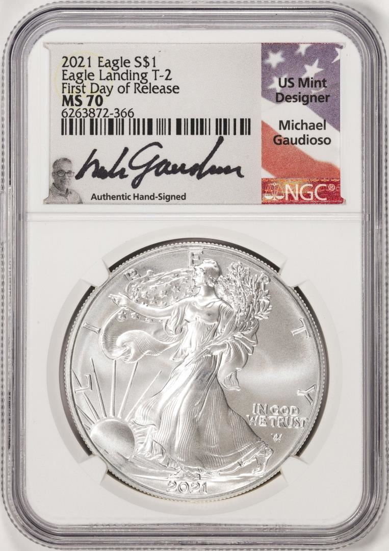 2021 Ty. 2 $1 American Silver Eagle Coin NGC MS70 First Day Release Gaudioso Signed