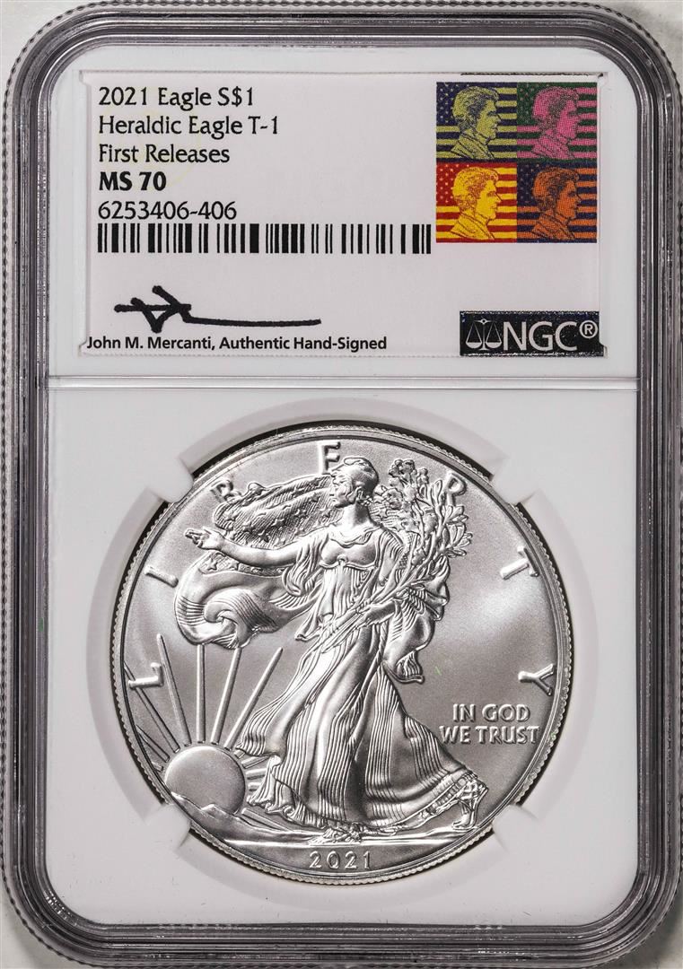 2021 Type 1 $1 American Silver Eagle Coin NGC MS70 First Releases Mercanti Signed