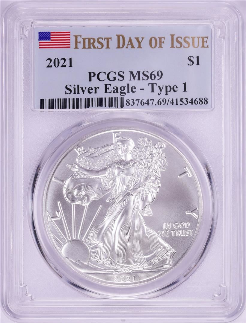 One 2021 Type 1 $1 American Silver Eagle Coin PCGS MS69 First Day of Issue.